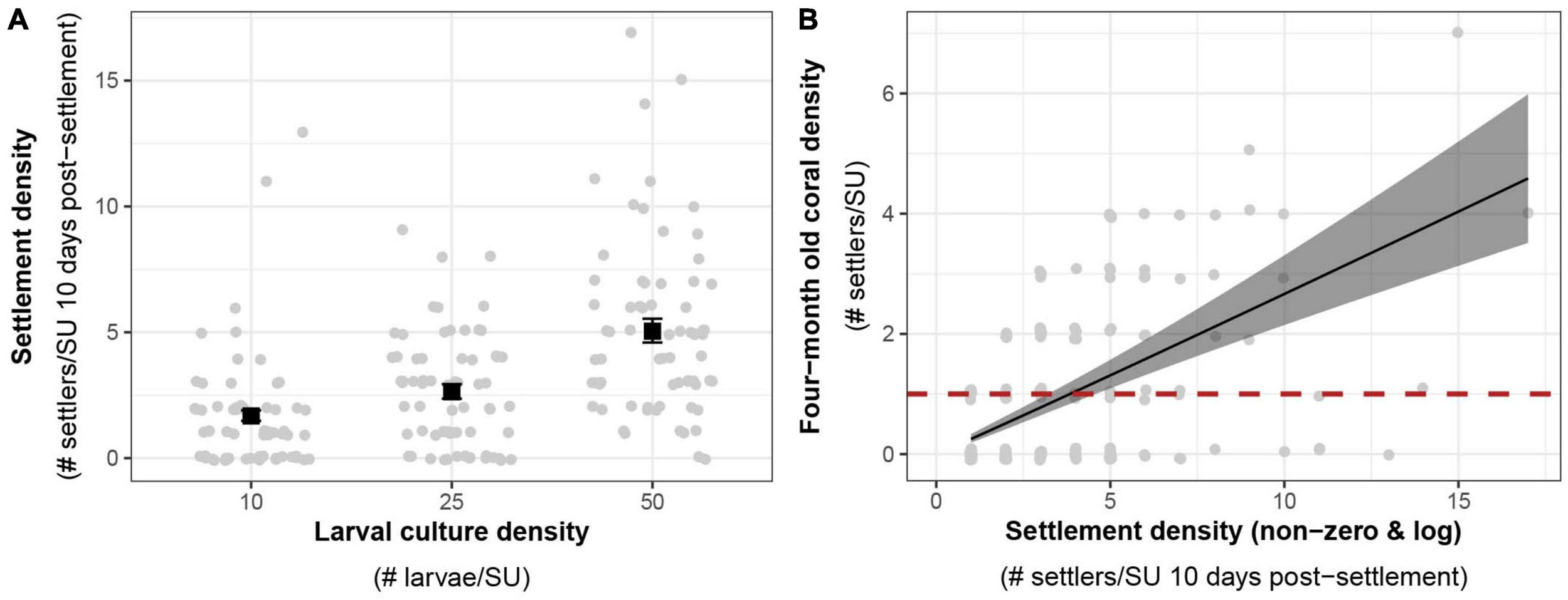 (A) Effects of larval density on settlement density. Average expected response values among settlement tanks (black squares) from negative binomial GLMMs are shown with standard error bars. (B) Expected relationship between settlement density and colony density after 4 months (132 days, black line and standard error) among ex situ nursery tanks derived from a negative binomial GLMM. Equation: four months coral density = exp[–1.44 + 1.02 × log(Non-zero settlement density)]. The critical target threshold of 1 coral per substrate after four months is represented with a red dashed line. Raw count data (gray circles) are visualized with a jitter to minimize overlap of points in the two graphs.