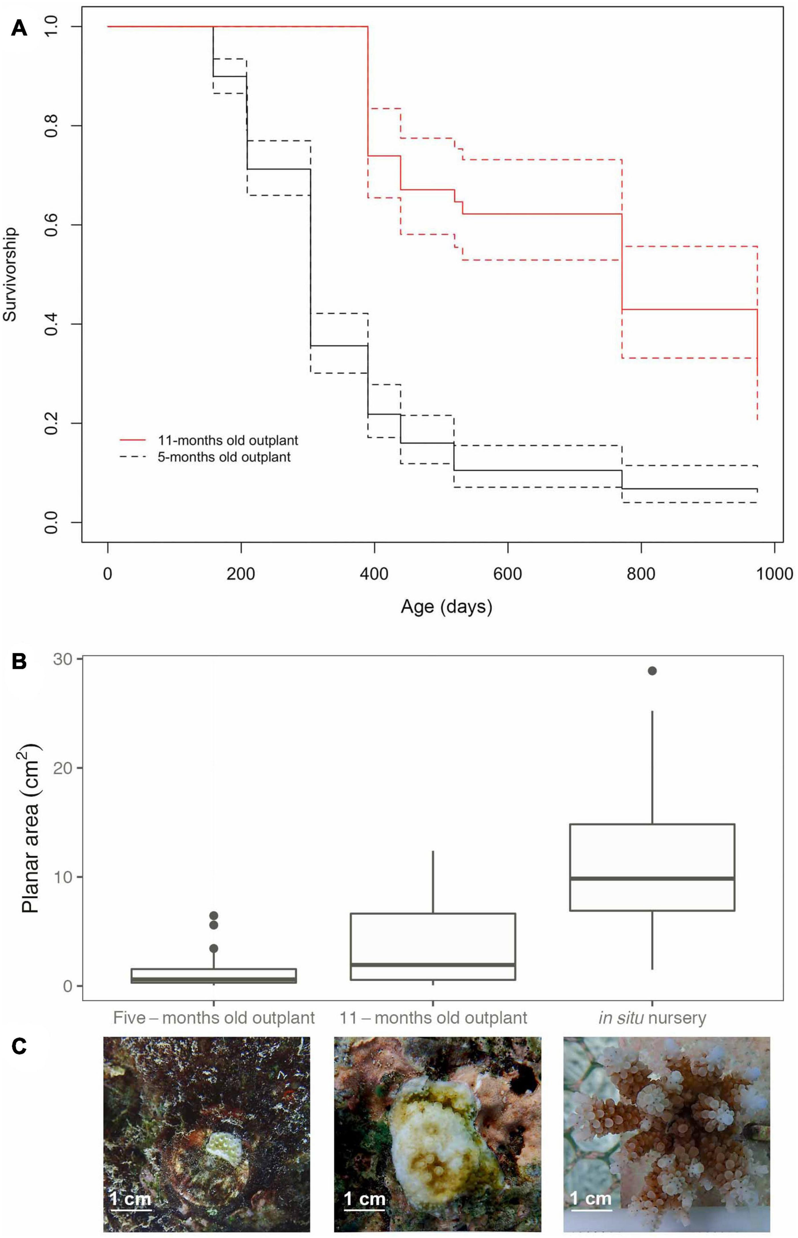 (A) Survivorship curves for Acropora digitifera corals outplanted to the reef when colonies were 5-months (black line) and 11-months old (red line). Dashed lines indicate 95% confidence intervals. (B) Planar area comparison between colonies from the ex situ nursery that were outplanted to the reef at 5 and 11-months old or transferred to the in situ nursery at 13-months old. (C) Images showing representative corals in the different treatments at the same age (17-months old).