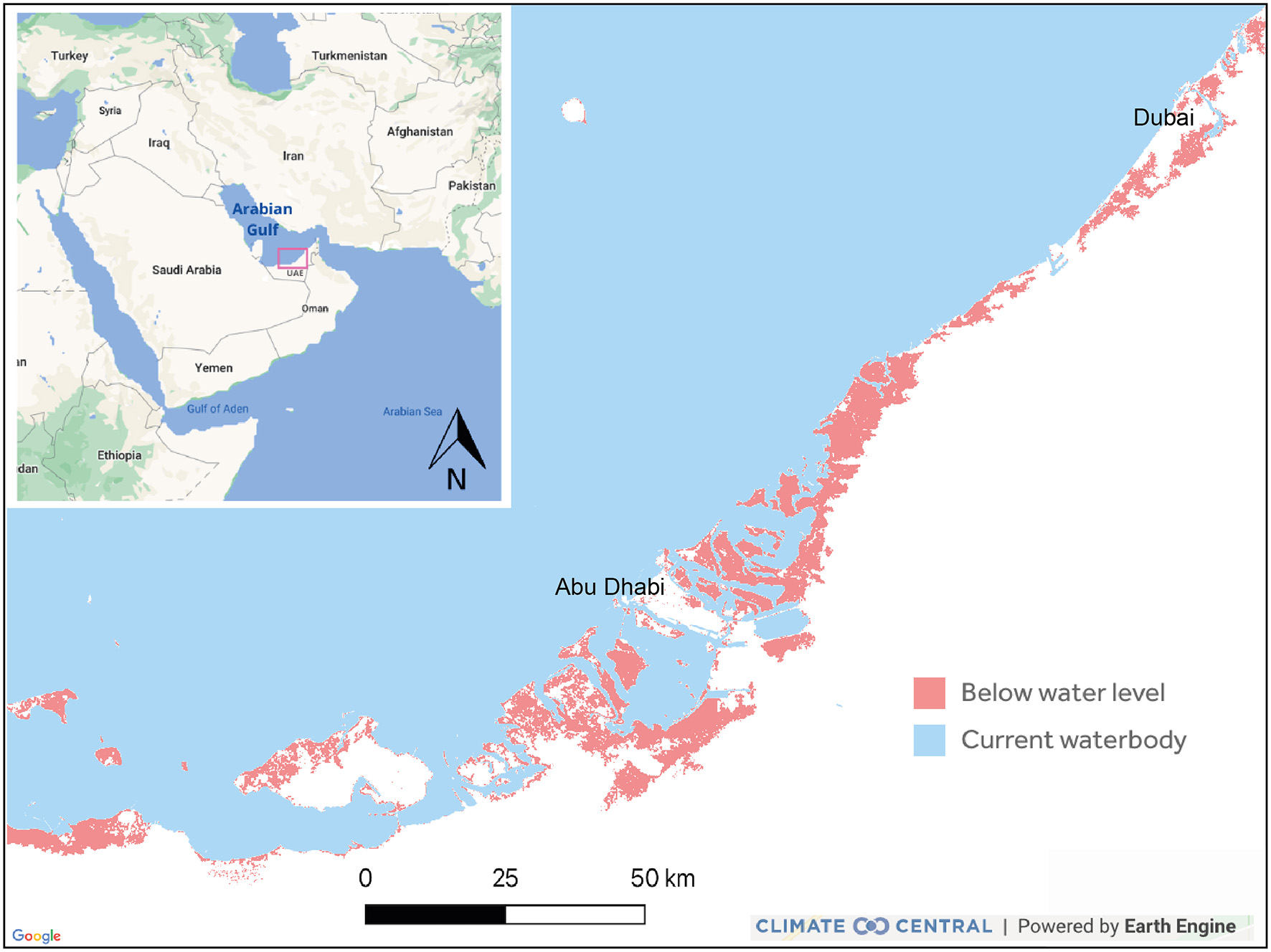 Extent of projected Sea-Level Rise for two major cities in the UAE from Climate Central CoastalDEM (Kulp and Strauss, 2019). Red shading shows regions expected to experience flooding by 2100 under a moderate 2° Celsius warming scenario (RCP 4.5) and a Kopp et al. (2014) mid-range projection.
