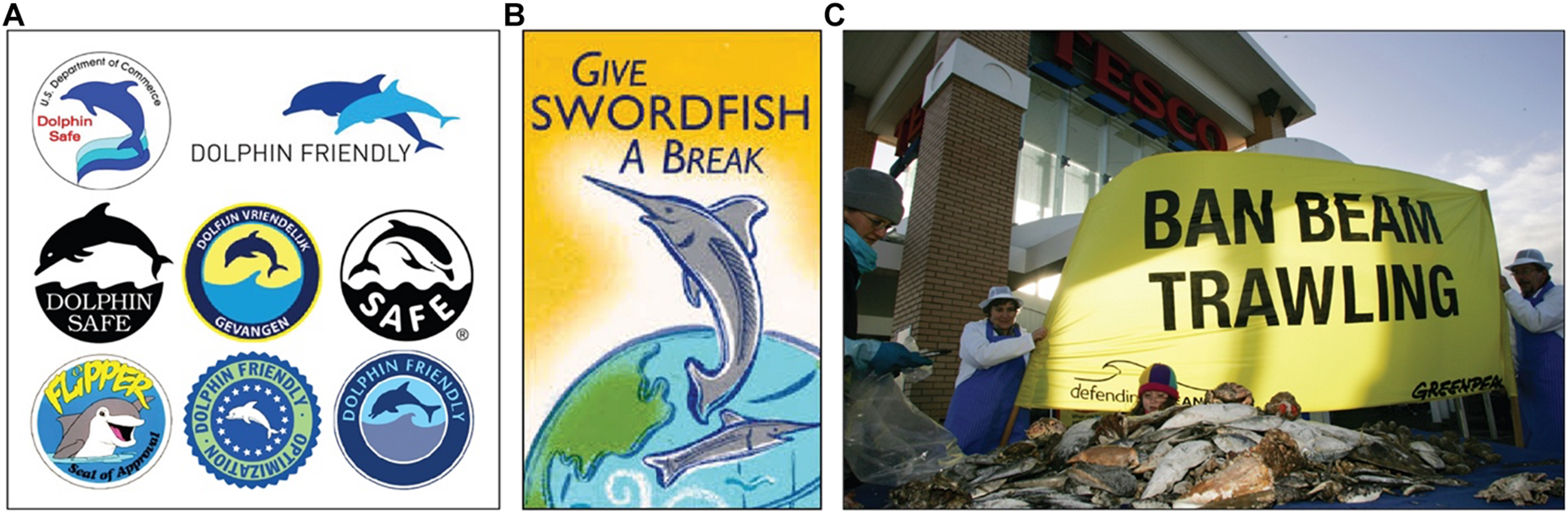 Seafood boycott milestones. (A) Dolphin-safe tuna labels; (B) poster for “Give Swordfish a Break” campaign; (C) bycatch deposited outside a Tesco supermarket in the United Kingdom during Greenpeace’s “Recipe for Disaster” campaign (Photograph from John Cobb, reproduced with permission from Greenpeace image database https://bit.ly/3sof9gc).