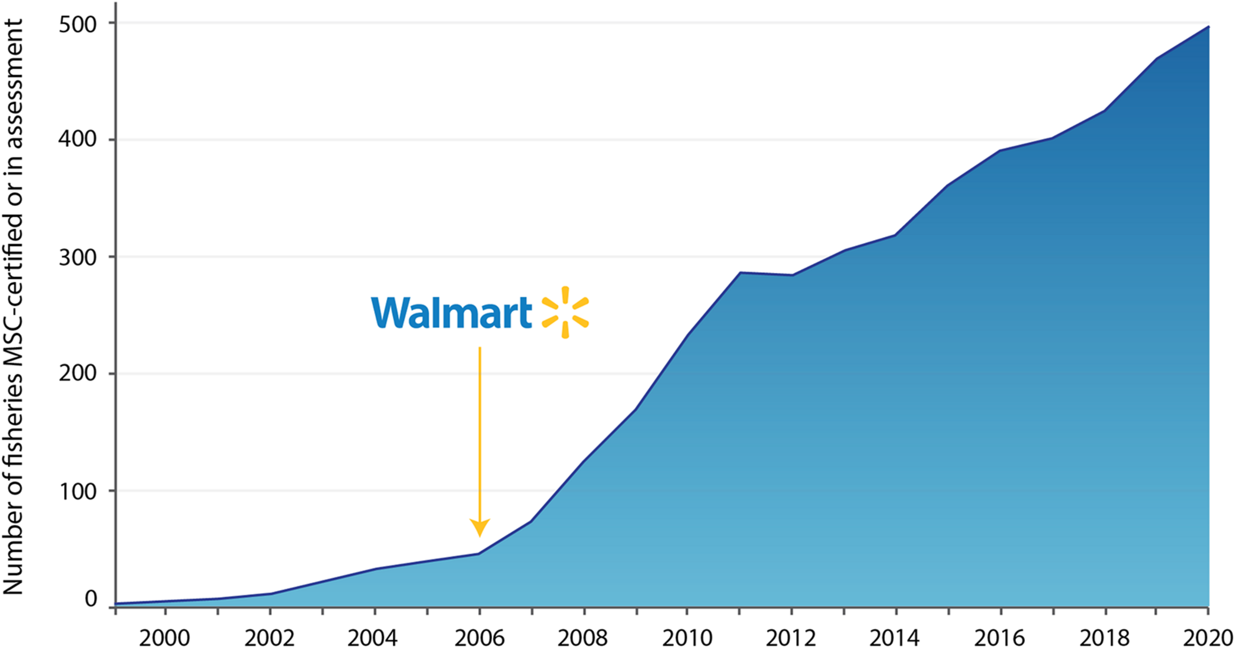 Growth in number of fisheries MSC-certified or in assessment. In January 2006, the world’s largest retailer, Walmart, announced its (unmet) pledge to only sell MSC-certified fish by 2010.
