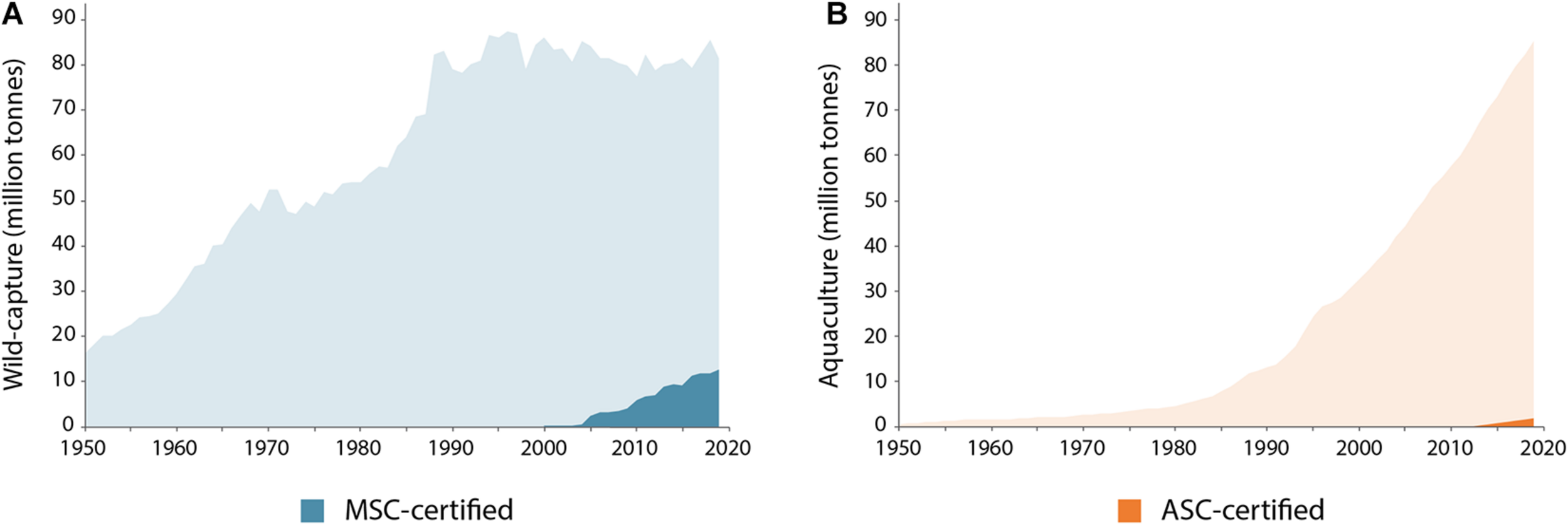 Global production and eco-certifications. Volumes of (A) wild-capture marine fisheries and (B) aquaculture production and corresponding share of MSC-certified and ASC-certified production, respectively. Global production data are from the FAO FishStatJ 4.01.0. MSC- and ASC-certified volumes were provided by MSC and ASC, respectively.
