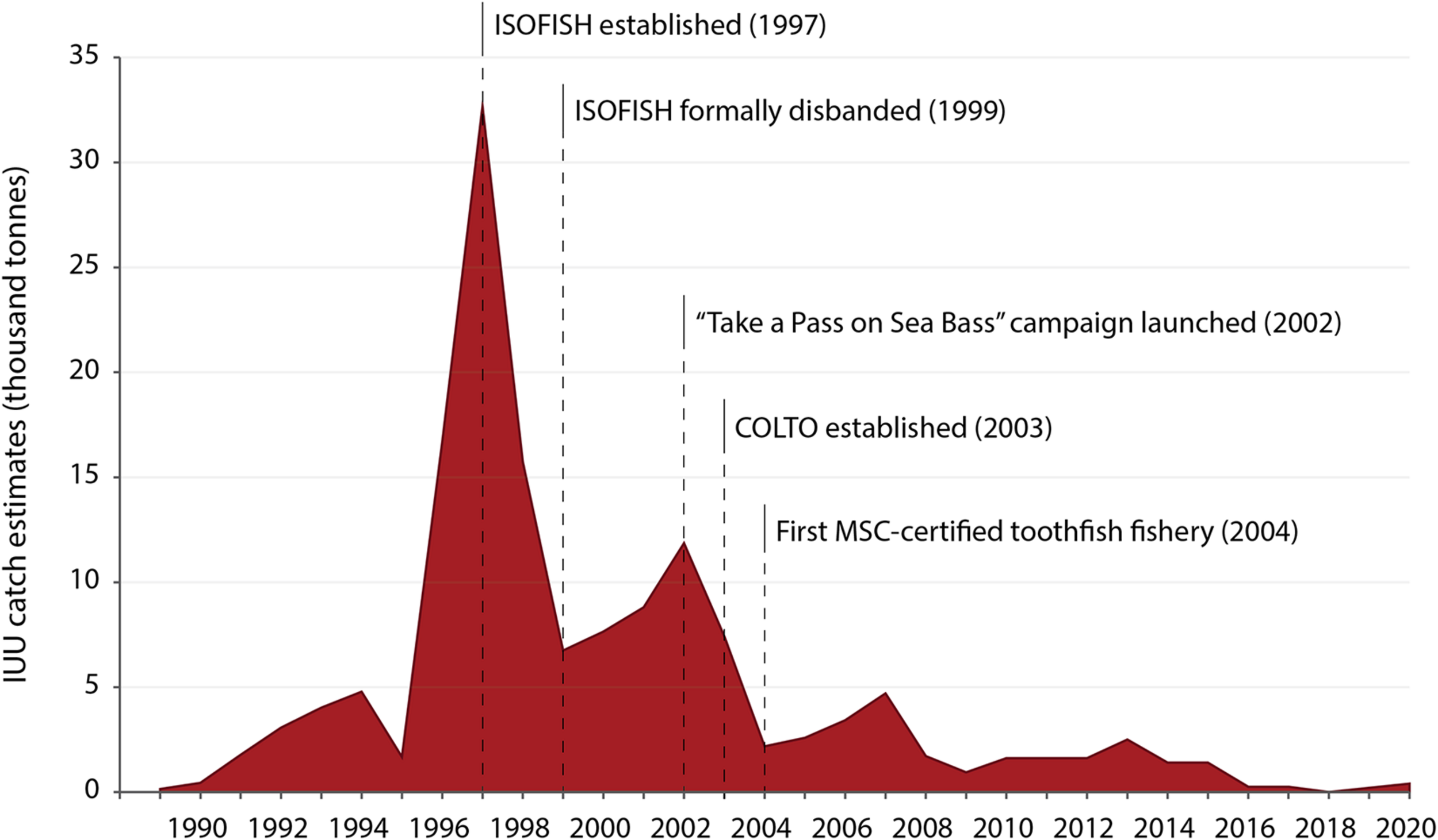 The Coalition of Legal Toothfish Operators (COLTO), founded in 2003, is exemplary of the potential for VEPs to foster sustainable fisheries and solve a series of problems that national governments were struggling to address. Patagonian toothfish (Dissostichus eleginoides) are a long-lived fish (often living for over 50 years) generally found in deep waters of the Indian Ocean, South Georgia and Patagonian shelf (Collins et al., 2010). Creatively rebranded as “Chilean seabass,” Patagonian toothfish supports a valuable fishery, which expanded rapidly in the early 1990s to reach peak levels of annual reported catch that exceeded 40,000 tons in 1995. Yet catches were substantially higher due to the prevalence of highly lucrative illegal, unregulated and unreported (IUU) fishing, estimated at 35,000 tons (with a value of USD 150 million) in 1997 (Figure 4; Österblom and Bodin, 2012; Pala, 2015). Illegal toothfish operations were depleting toothfish stocks so rapidly that the future of legal fisheries was also at risk – illegal operations also relied on deep-sea longlines that were catching so many seabirds that the stocks of multiple albatross species (Diomedidae) and white-chinned petrels (Procellaria aequinoctialis) were likely on the verge of collapse (Nel et al., 2002; Österblom and Bodin, 2012). By the early 2000s, retailers were halting sales of Chilean seabass, and over 1,000 chefs had agreed to “Take a Pass on Sea Bass,” a campaign launched by the National Environmental Trust in the style of the previous dolphin-safe tuna and “Give Swordfish a Break” efforts (Wu, 2006).