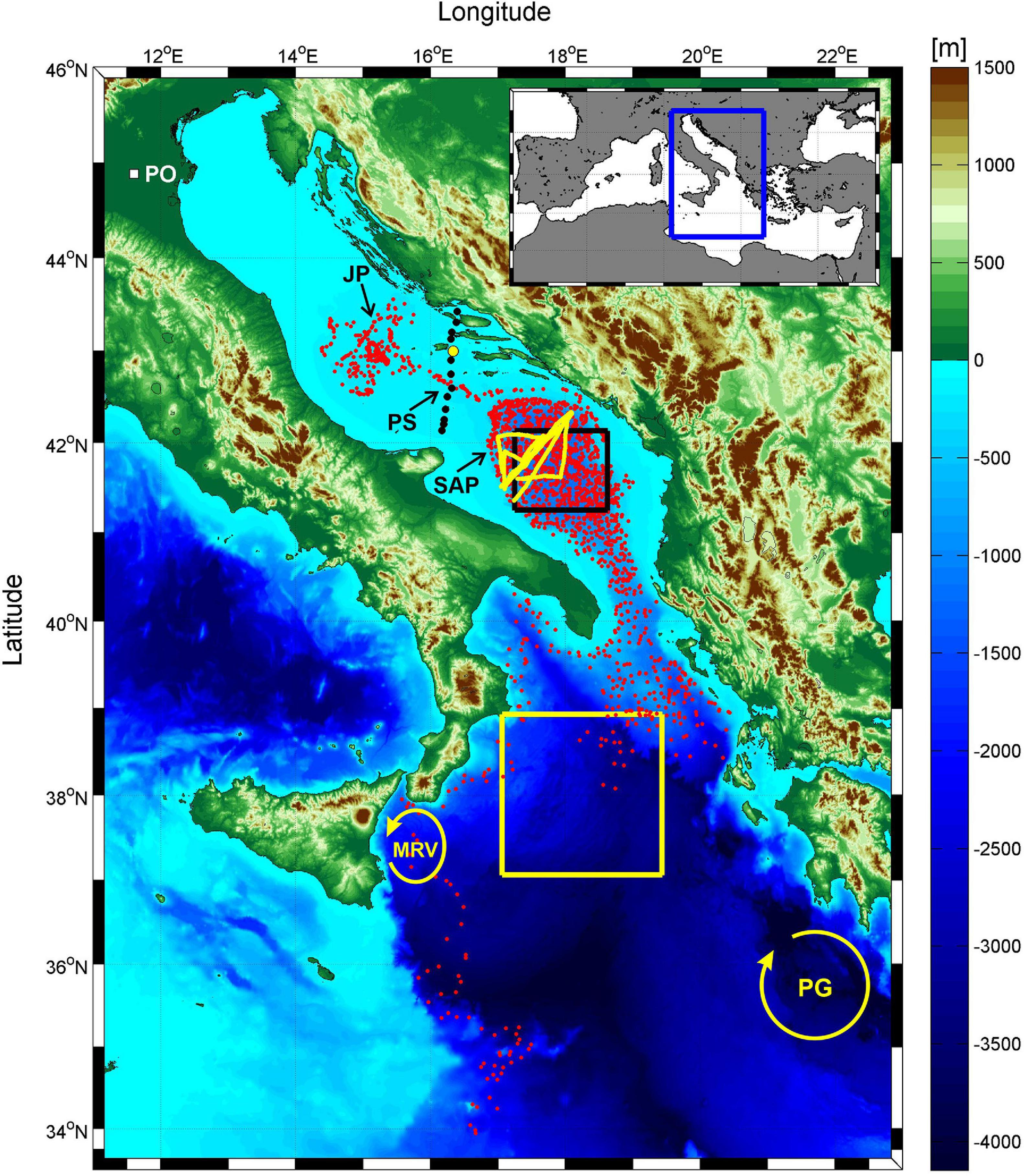 The bathymetry of the Adriatic-Ionian basin. The positions of Argo profiles used in the study are denoted by small red dots. CTD stations at the Palagruža Sill transect are indicated by black dots, with Stončica station (CJ009) denoted by larger yellow dot. Glider trajectories in the Southern Adriatic are marked by yellow lines. JP, PS and SAP stand for the Jabuka Pit, the Palagruža Sill and the South Adriatic Pit, respectively. The black rectangle in the Southern Adriatic indicates the area over which heat and water fluxes were estimated. The yellow rectangle in the Northern Ionian represents the area used for computation of vorticity. The positions and the sense of rotation of the Messina Rise Vortex (MRV) and the Pelops Gyre (PG) are also indicated. Pontelagoscuro station, at which Po River discharge are measured, is indicated by the white square in the upper left part of the figure.
