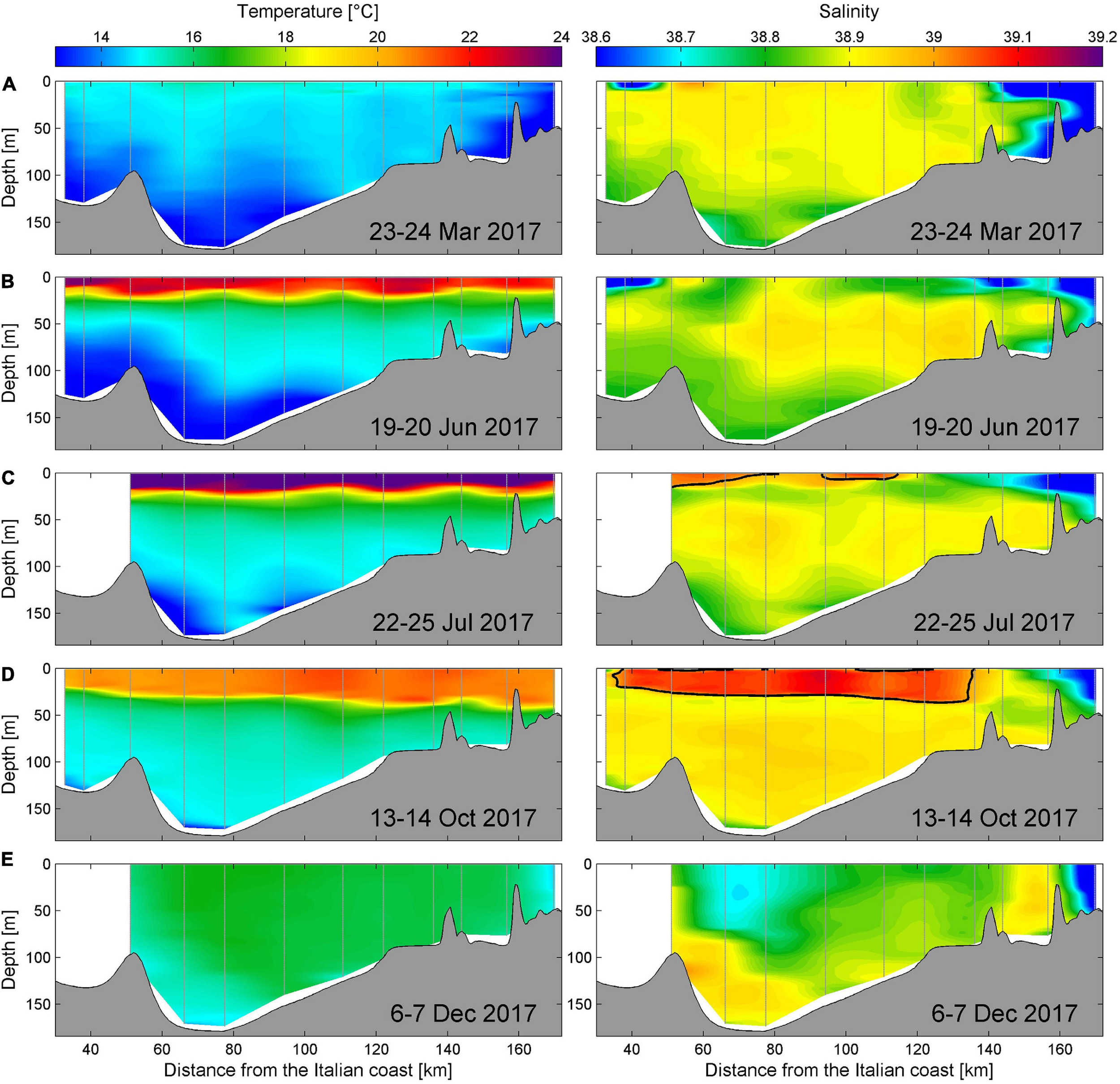 Temperature and salinity measured at the Palagruža Sill transect: (A) 23–24 March 2017, (B) 19–20 June 2017, (C) 22–25 July 2017, (D) 13–14 October 2017 and (E) 6–7 December 2017. Salinity values higher than 39.0 are encircled with black line in salinity plots. Vertical gray lines denote CTD casts.