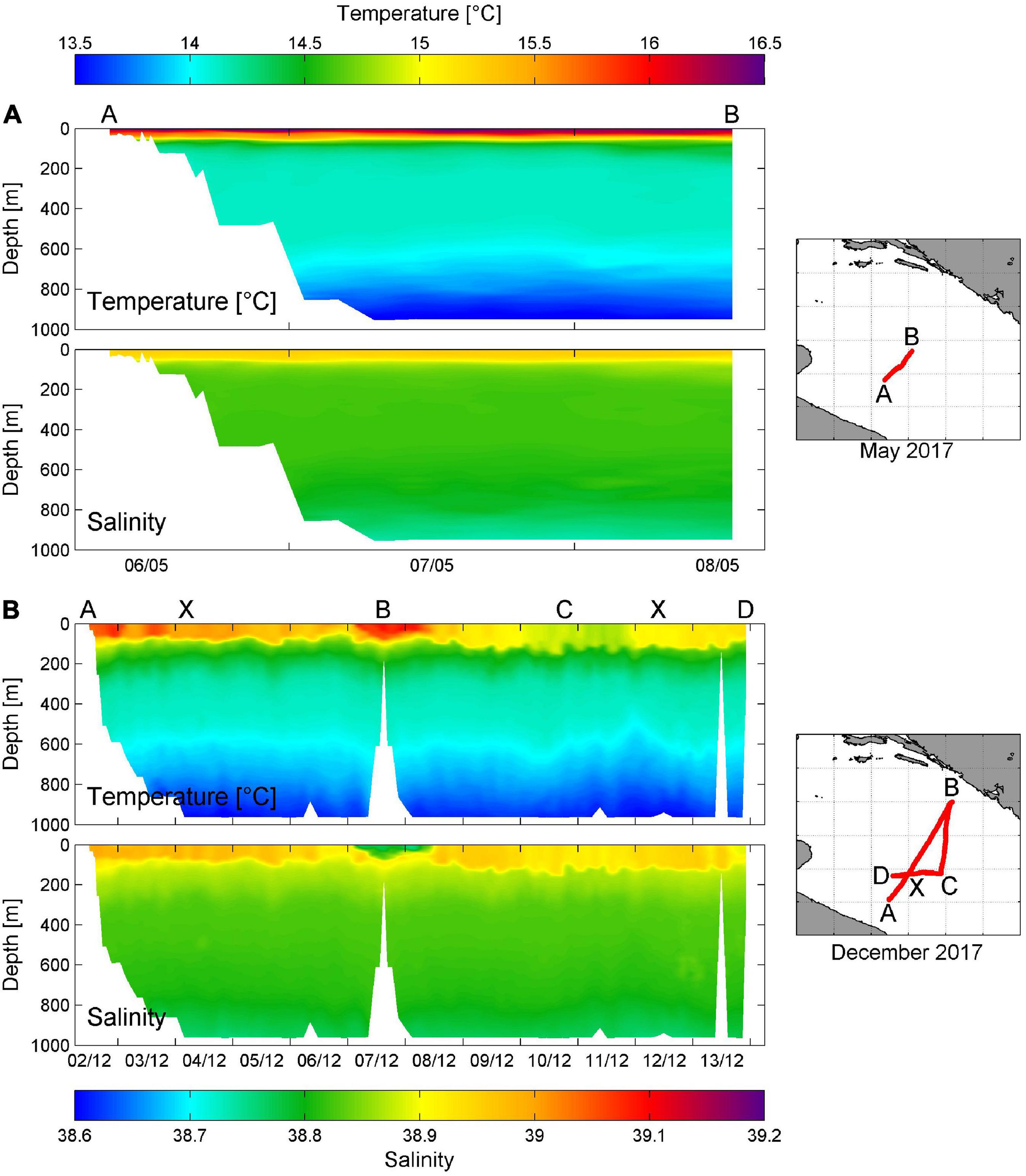 (A) Glider temperature and salinity transects in the in the Southern Adriatic between 6 and 8 May 2017 (left panels) and the corresponding trajectory of the glider (right panel). (B) As in panel (A) except for glider transect from 2 to 13 December 2017. The crossing point between the “A–B” and “C–D” segments of the December 2017 glider mission is indicated by letter “X.”
