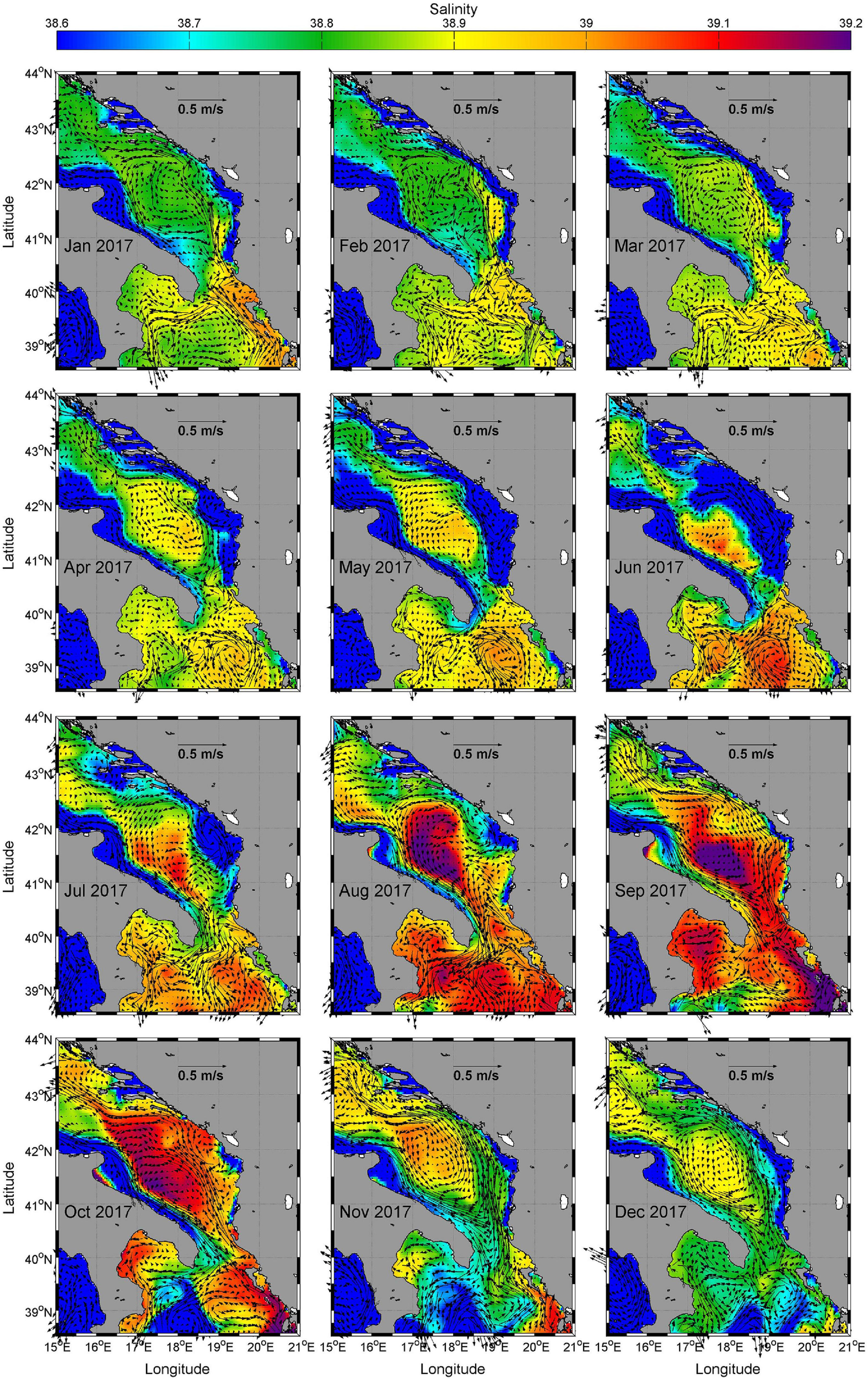 The pool of high surface salinity waters in the SAP further developed and widened in July (Figure 5), while the modeled currents in the western part of the SAP were mostly southward oriented and the majority of these waters was leaving the Adriatic Sea. However, CTD measurements at the Palagruža Sill transect in July 2017 indicated exceptionally high surface salinity in the central and southern part of the transect (Figure 2C), possibly related to the inflow from the Southern Adriatic and local salinification above the thermocline. The surface salinity reached 39.2 in the central and southwestern parts of the SAP in August. The core of the exceptionally highly saline salinity waters remained in the SAP throughout September, and the enhanced EAC started to bring some of these waters northwestward over the Palagruža Sill. Simultaneously, the exchange between the Adriatic and the Northern Ionian significantly increased, enabling additional salt advection to the Southern Adriatic. The advection of highly saline surface waters toward the Palagruža Sill reached the maximum in October (Figures 2D, 5) during which the overall along-basin surface transport was the highest. Signs of the surface salinity decrease began in November (Figure 5), but still keeping the maximum value in the central SAP.