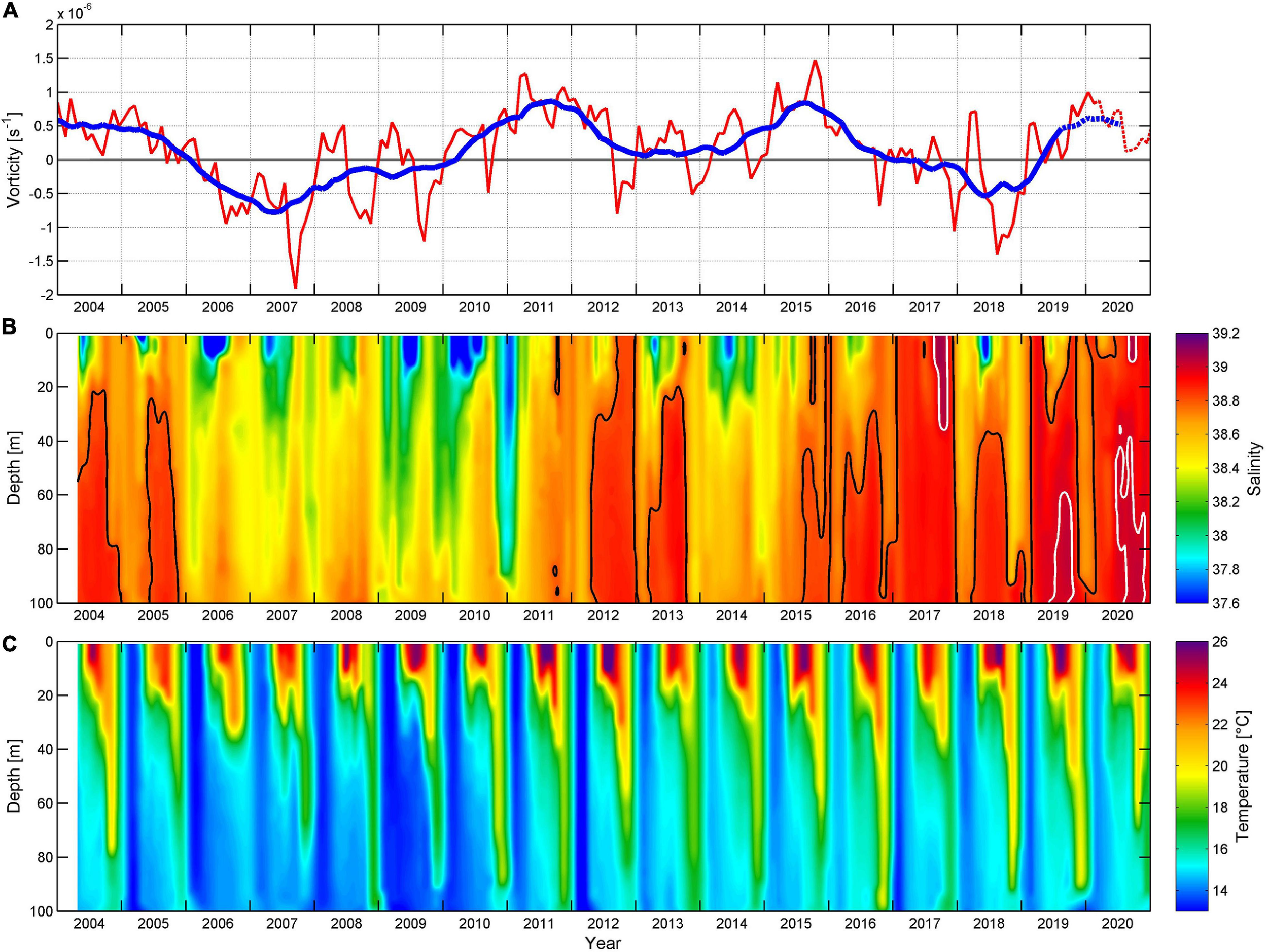(A) Monthly time series of the spatially averaged current vorticity (red line) and low-pass filtered (13 months) current vorticity (thick blue line) computed in the Northern Ionian Sea (37–39°N; 17–19.5°E) between January 2004 and December 2020. Dashed parts in panel (A) denote vorticity data based on near real time AVISO+ product. (B) Hovmöller diagram of salinity measurements at station CJ009 between April 2004 and December 2020. Thick black line in panel (B) indicates 38.8 salinity contour (high salinity conditions), while thick white line denotes 39.0 contour (exceptionally high salinities). (C) Hovmöller diagram of temperature measurements at station CJ009 between April 2004 and December 2020.