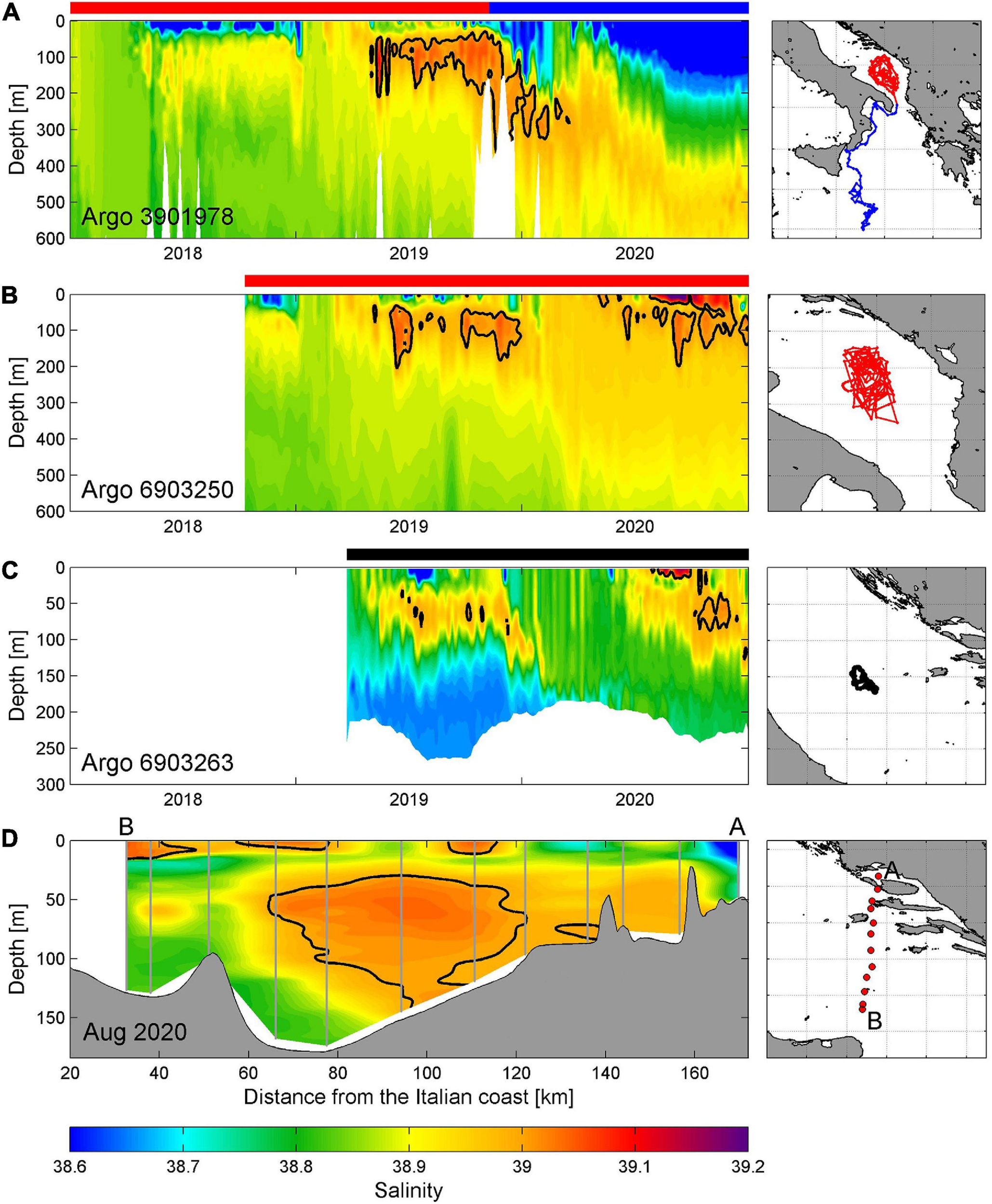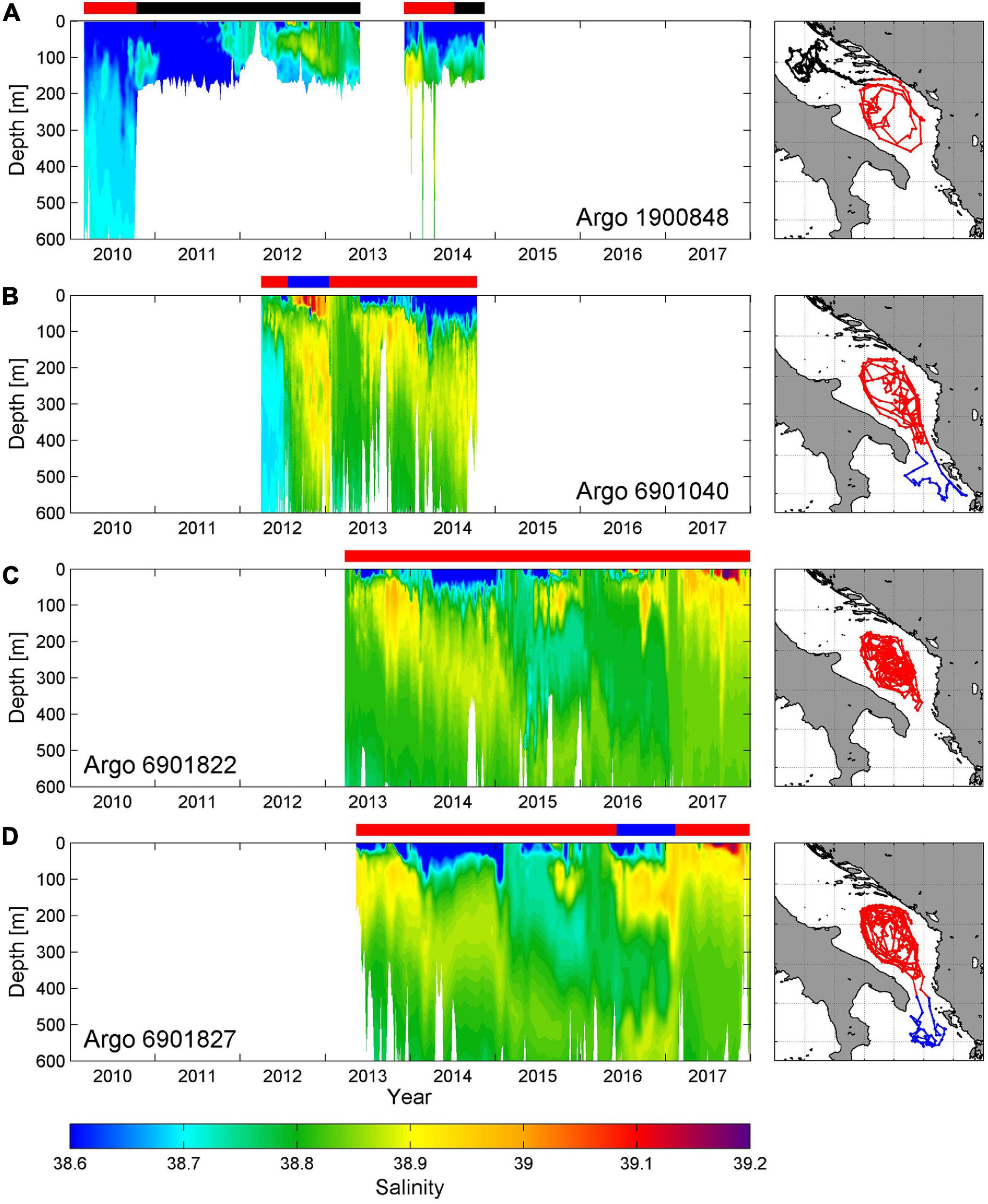 (A) Hovmöller diagram of salinity data for Argo float 1900848 in the first 600 m in the period 2010–2014 (left panel) with corresponding float trajectory (right panel). (B–D) As in panel (A) except for Argo floats 6901040 (2012–2014), 6901822 (2013–2017) and 6901827 (2013–2017), respectively. Argo trajectories are colored depending on the location of the float (black–Middle Adriatic, red–Southern Adriatic, blue–Northern Ionian). The same color notation is used in horizontal bars above left panels, indicating periods during which Argos were profiling in respective areas.