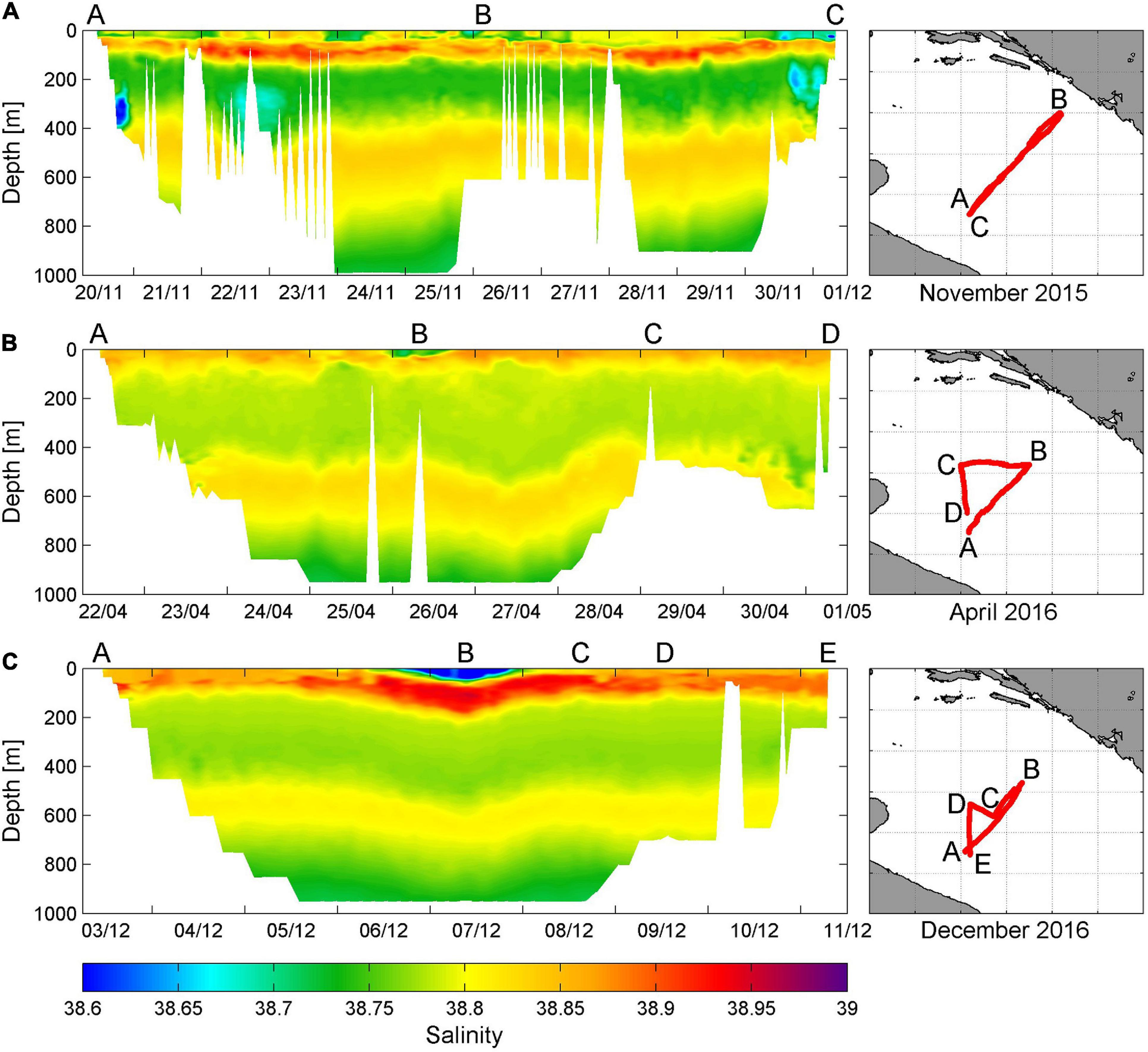 (A) Glider salinity transect in the in the Southern Adriatic between 20 November and 1 December 2015 (left panel) and the corresponding trajectory of the glider (right panel). (B) As in panel (A) except for glider transect from 22 April to 1 May 2016. (C) As in panel (A) except for glider transect from 3 to 11 December 2016. Please note that the salinity scale for these glider transects is different than in Figure 4.