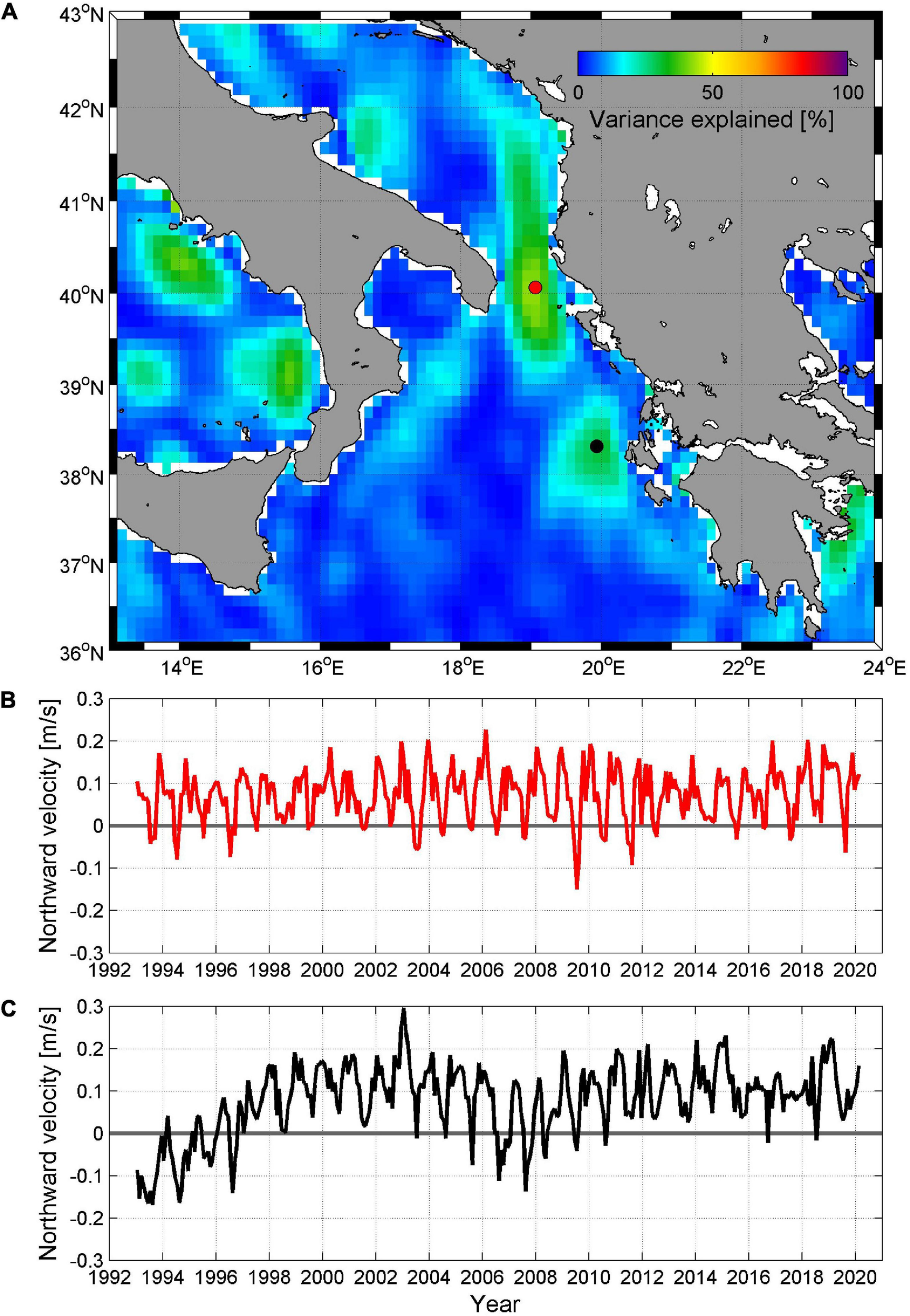 (A) Percentage of total geostrophic velocity variance explained by the seasonal signal, with two grid points denoted by red (Otranto Strait) and black (west of Cephalonia Island, Greece). (B) AVISO+ northward monthly geostrophic currents at the Otranto Strait grid point. (C) AVISO+ northward monthly geostrophic currents at the grid point west of Cephalonia.