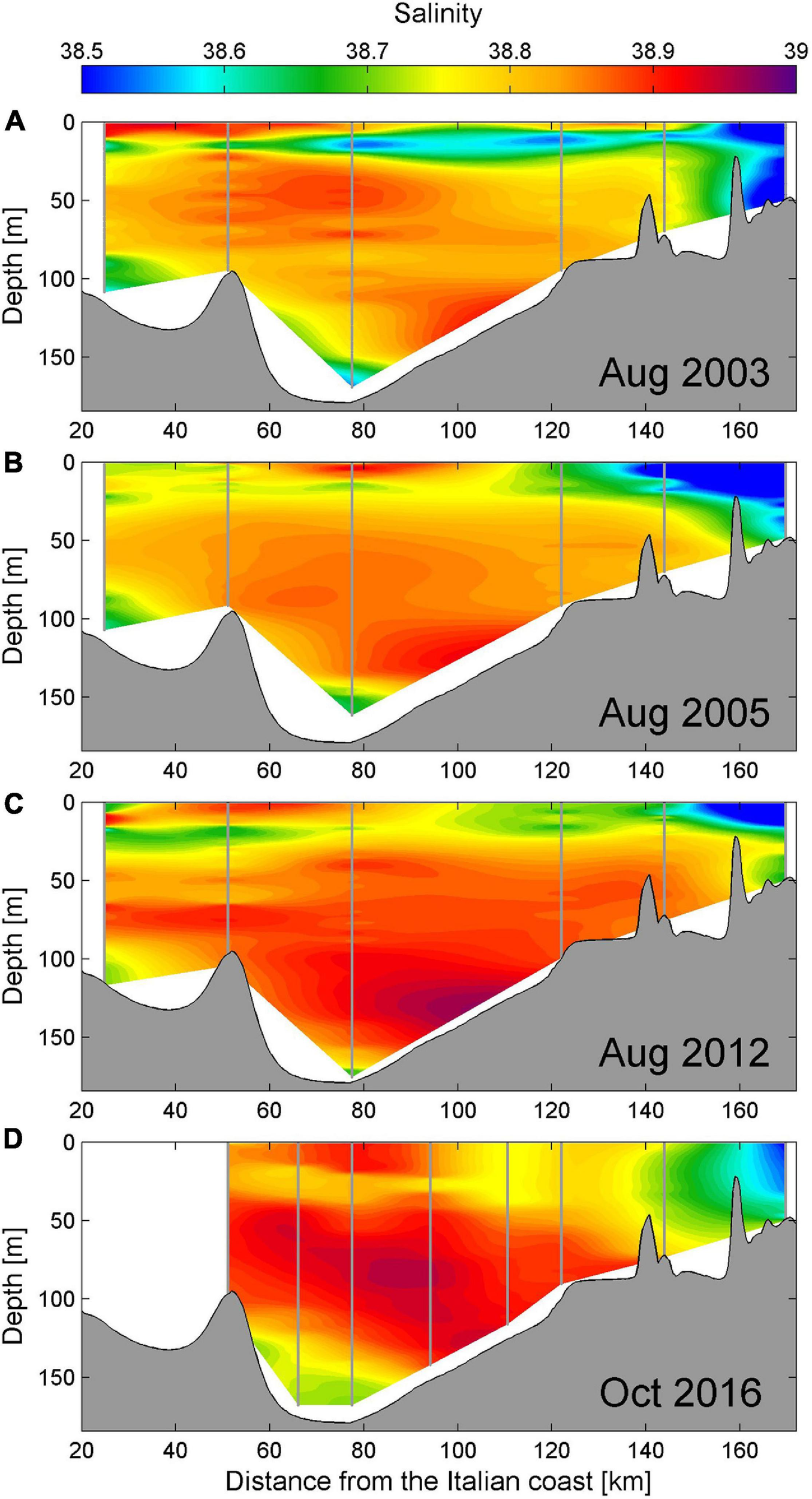 (A) Salinity profile at the Palagruža Sill transect in the second half of August 2003. (B–D) As in panel (A) except for mid-August 2005, the second part of August 2012 and the beginning of October 2016, respectively. Vertical gray lines denote CTD casts.