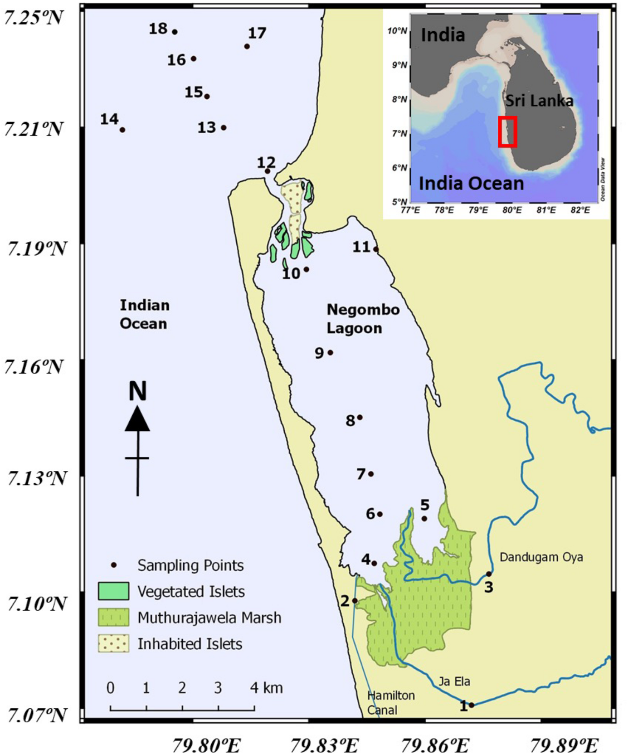 Sampling locations in the Negombo Lagoon and the adjacent coastal waters.