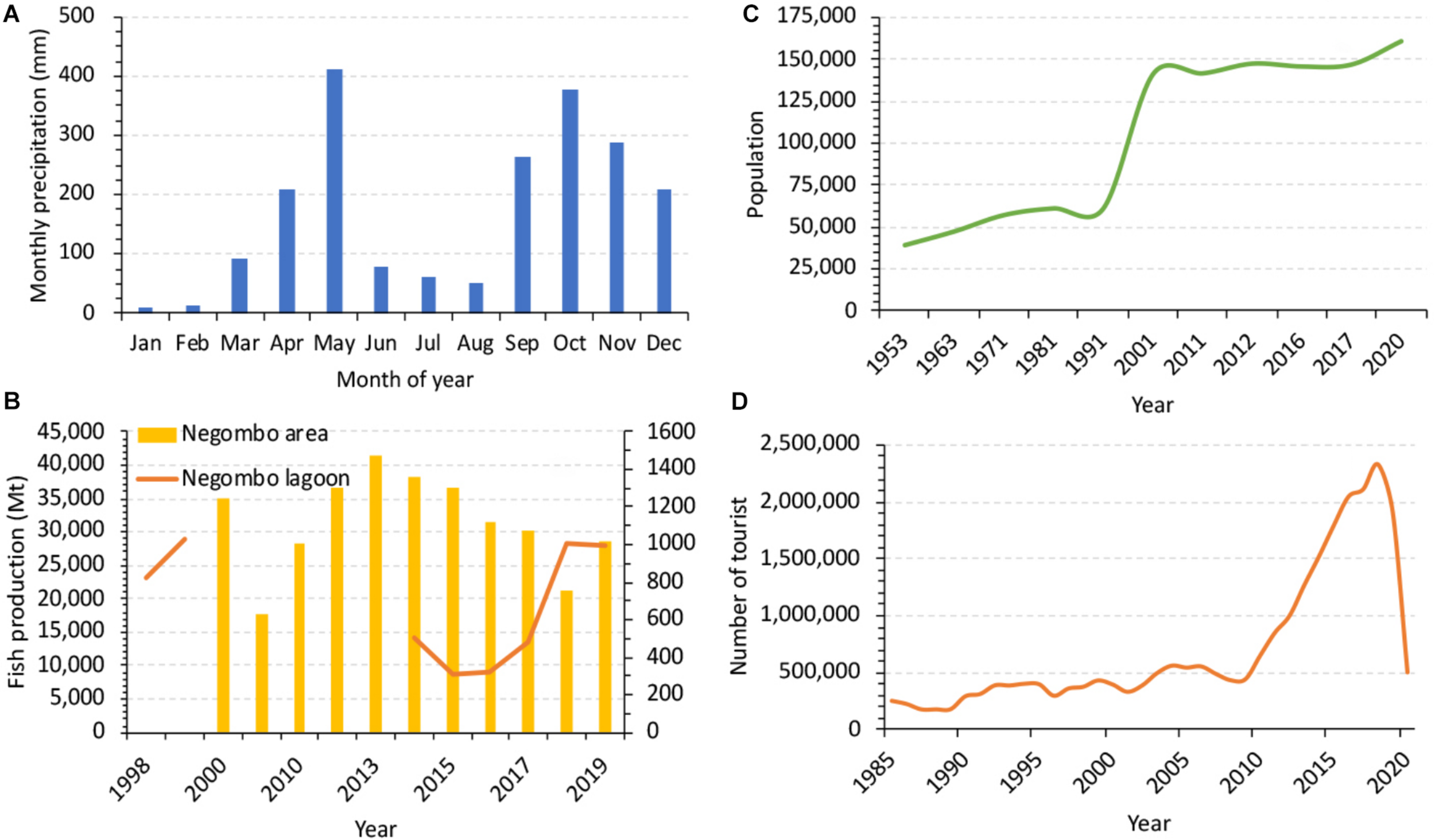 Information of (A) monthly precipitation, (B) fish production, (C) population, and (D) tourists in the Negombo lagoon and the adjacent area.