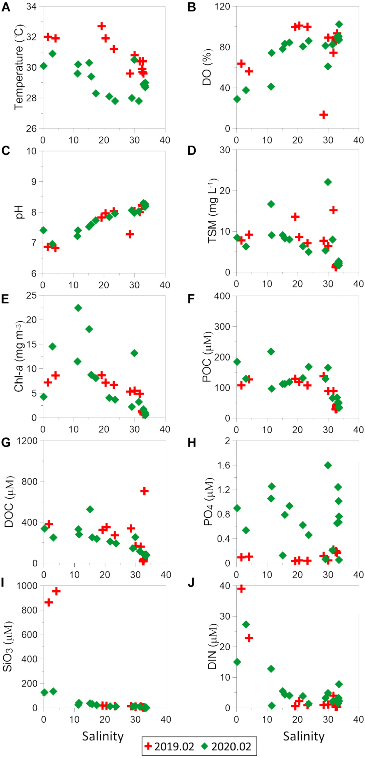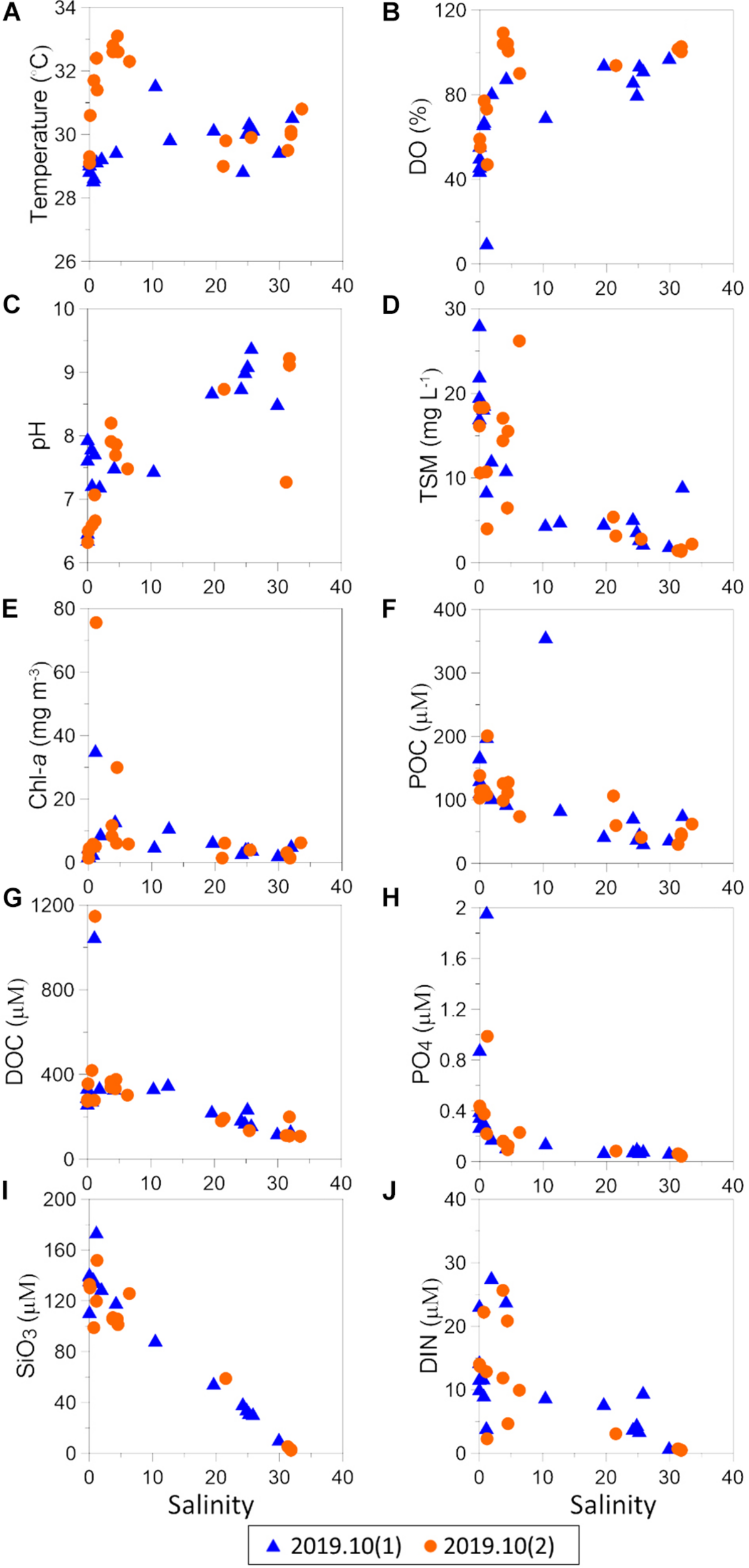 The distribution of (A) surface temperature, (B) DO, (C) pH, (D) TSM, (E) Chl-a, (F) POC, (G) DOC, (H) PO4, (I) SiO3, and (J) DIN along the salinity gradient in dry season.