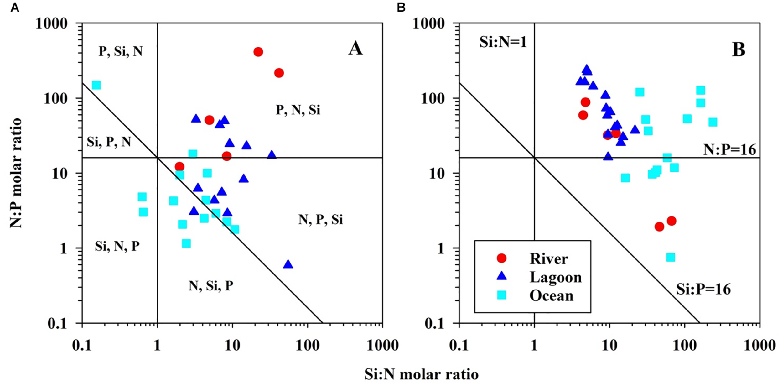 Molar ratio of Si:N:P in Negombo lagoon in dry season (A) and wet season (B). The potentially limited nutrients are divided from Redfield ratio (Si:N:P = 16:16:1). Different area in the plot was characterized by potentially limited nutrients in order of priority (Rocha et al., 2002).