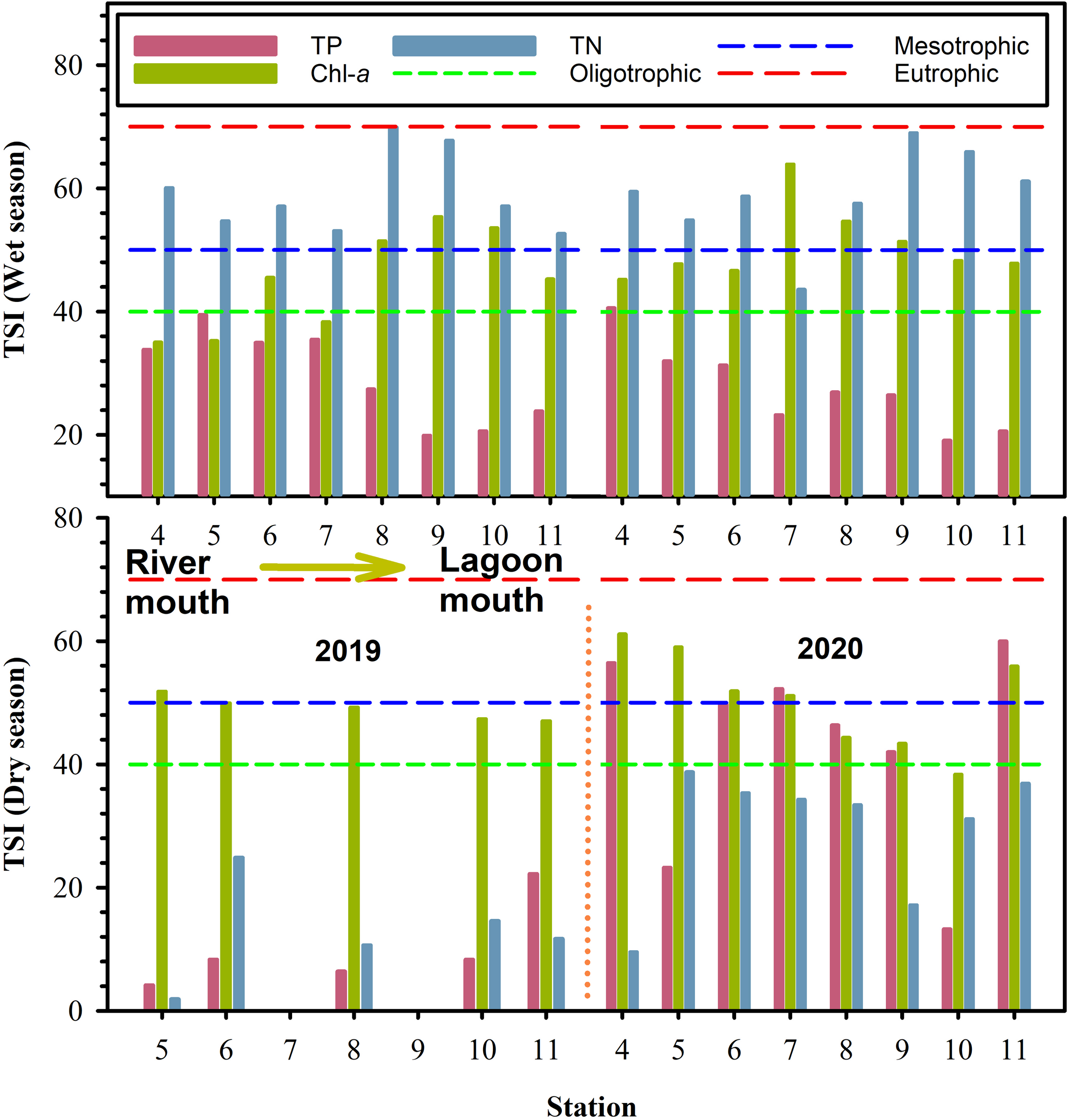 The units of TP and Chl-a were in μg L–1, and TN was in mg L–1. According to Kratzer and Brezonik (1981), TSI below 40 represents to oligotrophic state, TSI between 40 and 50 represents to mesotrophic, TSI from 50 to 70 represents to eutrophic, TSI above 70 represents to hypereutrophic state of the water.