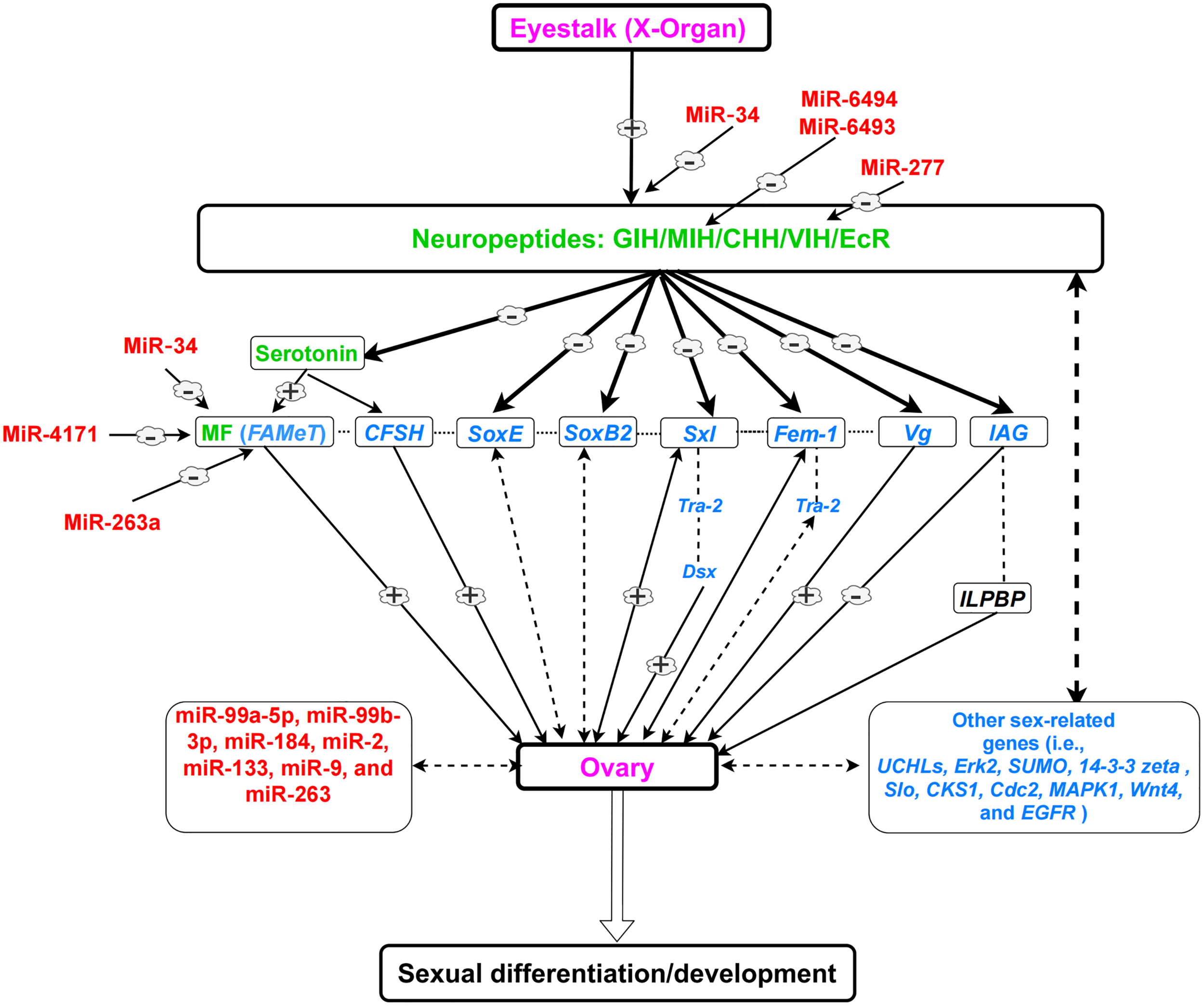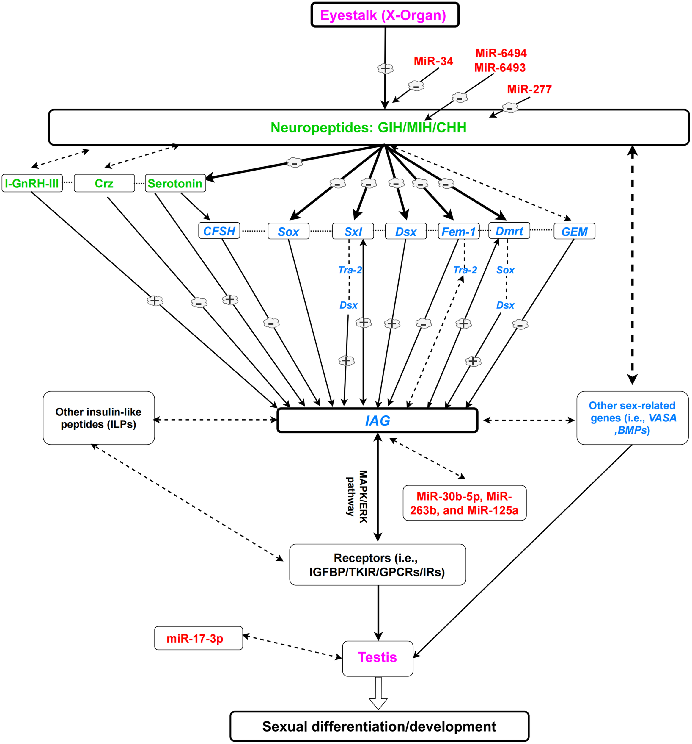The insulin-like androgenic gland hormone (IAG) secreted from androgenic gland (AG) is a key regulator in sexual differentiation. Recent studies have shown that IAG itself is controlled by several genes and hormonal factors (Shen et al., 2014; Shi L. et al., 2019; Zhong et al., 2019). The detailed mechanisms and the role of sex-related genes and miRNAs in the IAG regulation are discussed in detail in other sections of the present review. In the present review, we focus on the downstream mechanisms such as novel sex-related genes and miRNAs that play important role in the sexual development process. The present review aims to highlight gaps in knowledge that must be filled to allow further development of sexual manipulation techniques.