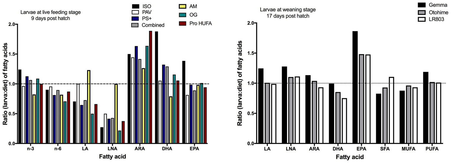 Florida pompano larvae at the live-prey feeding period-fed several enriched rotifer diets [Isochrysis sp. (ISO), Pavlova sp. (PAV), Protein Selco Plus (PS+), Ori-Green (OG), Protein highly unsaturated fatty acid (HUFA; PH), and AlgaMac 3050 (AM)] showed specific needs for DHA, EPA, and ARA, with selective retention of these three EFA (Figure 1). The FD ratio for EPA was relatively close to one in larvae fed the different enriched diets, particularly for the AM- and OG-enriched diets, showing accumulations of up to 7% of total FA (Table 2). Exceptions were noted for ISO-enriched diets, which showed ratios near 1.5. DHA requirements seemed to be satisfied by most diets, with an average of 15% of total FA (Table 2) and the best FD ratio for DHA being observed in larvae fed diets enriched with PAV and PH (ratio = 1.053 and 1.056, respectively). This suggests that these diets satisfied most physiological needs of the larvae at this developmental stage. All diets showed FD ratios above one for ARA, suggesting that these enrichments did not satisfy the requirements for this PUFA (Figure 1). The maximal ARA accumulation observed at the live-prey feeding stage was 3.5% of total FA (Table 2), with FD ratios between 1.26 and 1.89 depending on the diet. LA and LNA were not selectively retained by larvae at this stage, with ratios < 1 and low relative percentages of LNA (0.6% of total FA; Table 2). However, two diets (PAV and AM) seemed to better supply the LA and LNA requirements, with FD ratios equal to one (Figure 1). Overall, total omega 3 (n-3) and omega 6 (n-6) FD ratios were close to one for all diets (Figure 1), suggesting that the different enriched rotifer diets provided satisfactory amounts of n-3 and n-6 PUFA for larvae at the live-feeding stage.