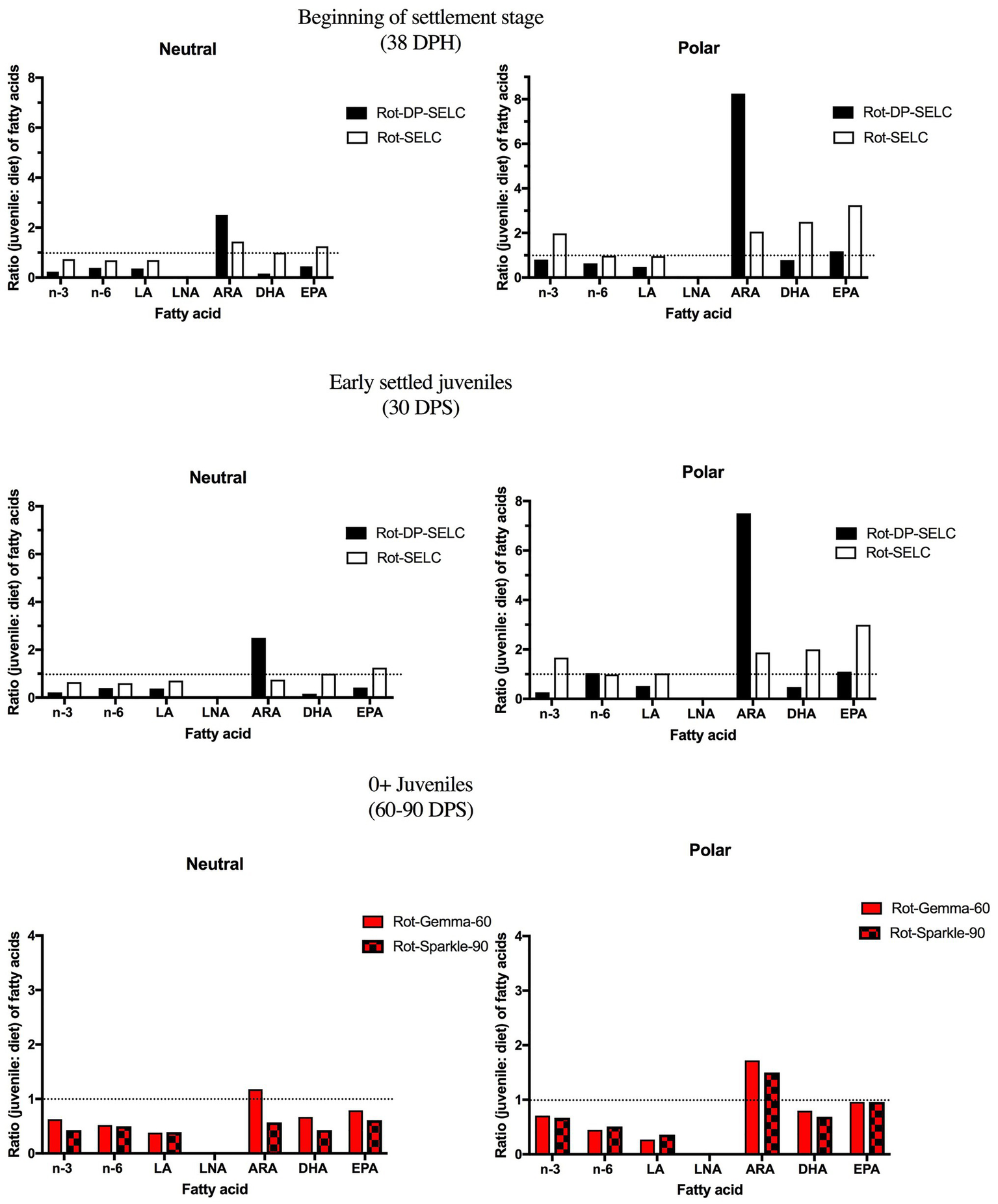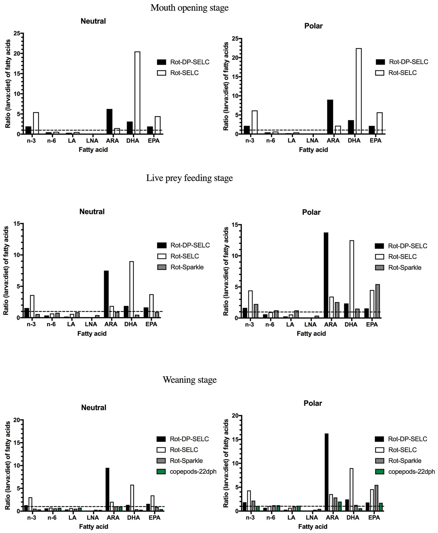 Ratio (larva: diet) of neutral and polar fatty acids in winter flounder (Pseudopleuronectes americanus) larvae at mouth opening (4 DPH), live feeding (15–16 DPH), and beginning of weaning (26 DPH). Larvae had been fed several enriched rotifer diets: Selco 3000 (SELC), DHA Protein Selco (DP-SELC), and sparkle-INVE (Sparkle). Larvae at 22 DPH were fed copepods (Seychelles et al., 2011; Martinez-Silva et al., 2018). The dashed lines (ratio = 1) indicate equal amounts of fatty acids in larvae and in the diet. LA, linoleic acid; LNA, linolenic acid; ARA, arachidonic acid; DHA, docosahexaenoic acid; and EPA, eicosapentaenoic acid.