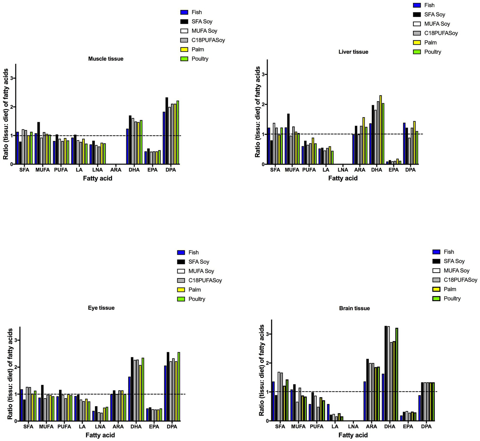 Ratio (tissue: diet) of fatty acids in juvenile Florida pompano (T. carolinus) muscle, liver, eye, and brain tissue (44 g average weight). Diet treatments consisted of a diet containing menhaden fish oil (Fish), SFA-enriched soybean oil (SFA Soy), MUFA-enriched soybean oil (MUFA Soy), 25:75 blends of fish oil and standard soybean oil (C18 PUFA Soy), palm oil (Palm), or poultry fat (Poultry; Rombenso et al., 2016). The dashed lines (ratio = 1) indicate equal amounts of fatty acids in the juveniles and in the diet. LA, linoleic acid; LNA, linolenic acid; ARA, arachidonic acid; DHA, docosahexaenoic acid; EPA, eicosapentaenoic acid; SFA, saturated fatty acids; MUFA, monounsaturated fatty acids; and PUFA, polyunsaturated fatty acids.