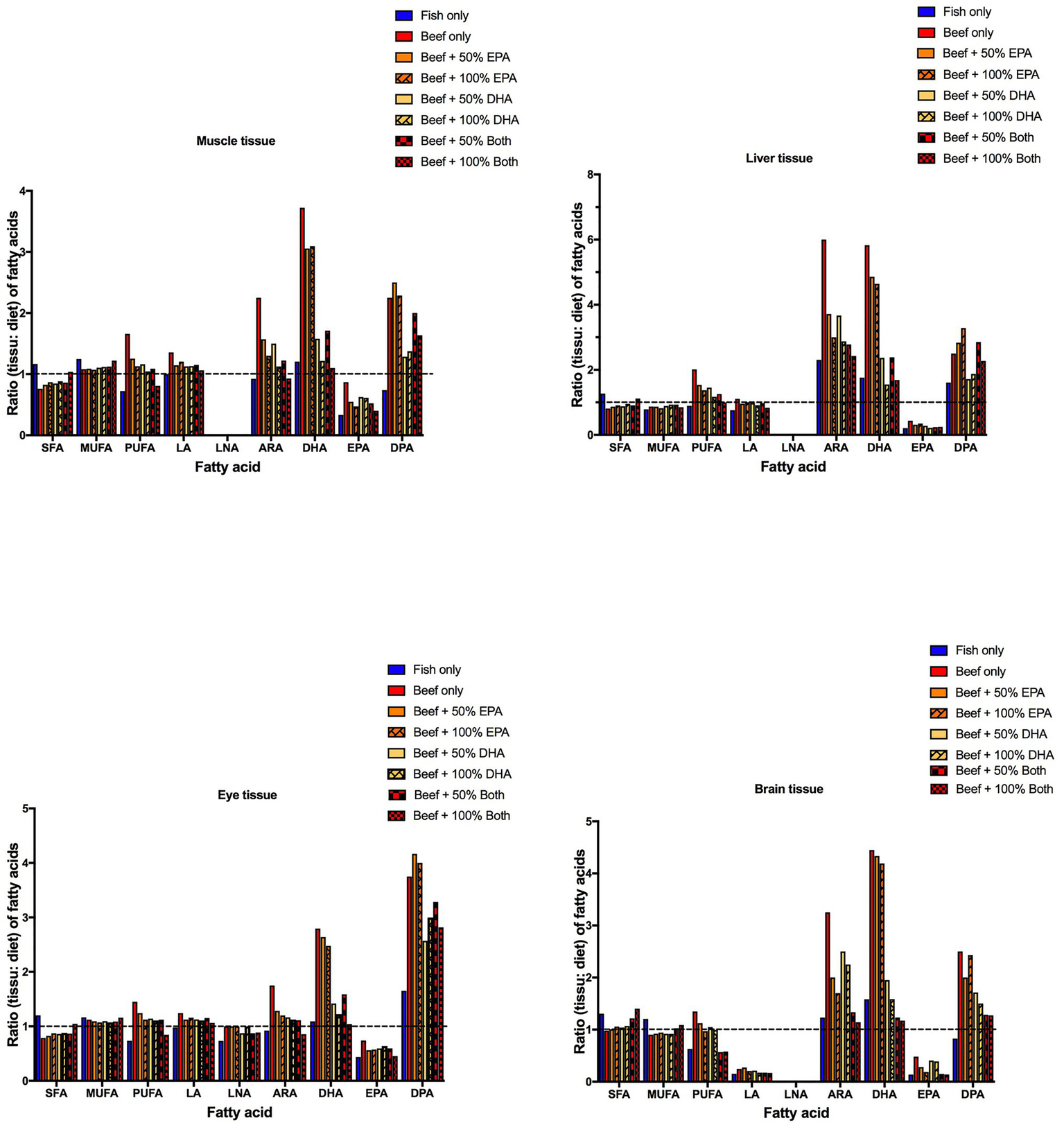 Ratio (tissue: diet) of fatty acid in juvenile Florida pompano (T. carolinus) muscle, liver, eye, and brain tissues (41 g average weight). Diet treatments contained fish oil, beef tallow, or beef tallow partially or fully supplemented with EPA, DHA, or both (Rombenso et al., 2017). The dashed lines (ratio = 1) indicate equal amounts of fatty acids in juveniles and in the diet. LA, linoleic acid; LNA, linolenic acid; ARA, arachidonic acid; DHA, docosahexaenoic acid; EPA, eicosapentaenoic acid; SFA, saturated fatty acids; MUFA, monounsaturated fatty acids; and PUFA, polyunsaturated fatty acids.