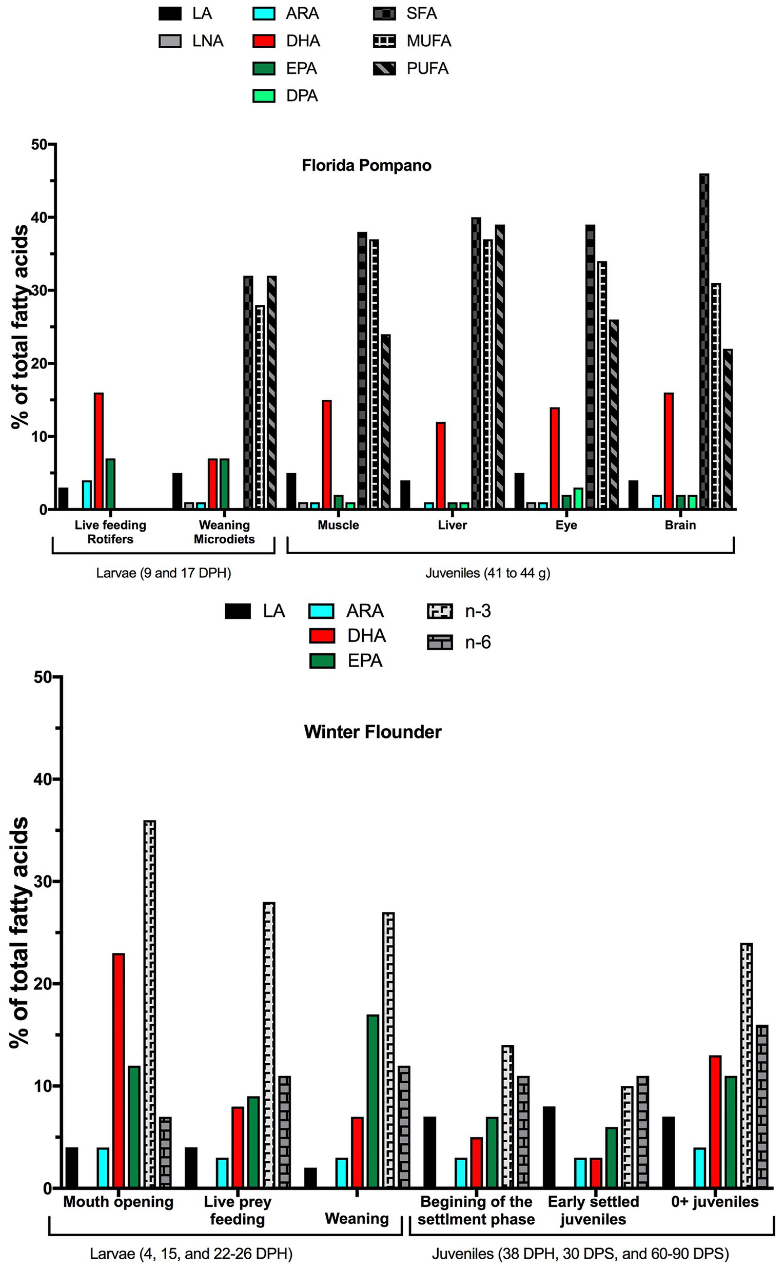 Data represent mean ± SD from all diet treatments at 9 and 17 DPH. LA, linoleic acid; LNA, linolenic acid; ARA, arachidonic acid; EPA, eicosapentaenoic acid; DHA, docosahexaenoic acid; SFA, saturated fatty acids; MUFA, monounsaturated fatty acids; and PUFA, polyunsaturated fatty acids.