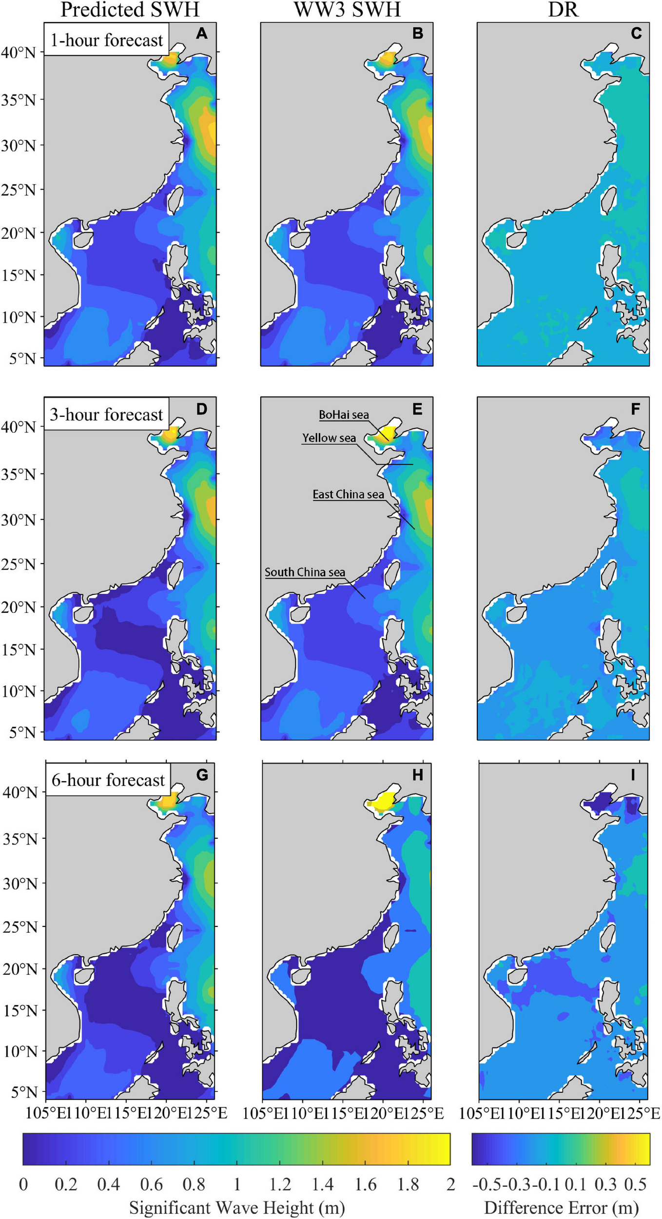Comparison of SWH from the WW3 and the ConvLSTM algorithm prediction. (A,D,G) are 1-, 3-, and 6-h predictions, respectively, based on the SWH data at 5:00, 6:00, and 7:00 on October 3, 2019. (B,E,H) The WW3 wave fields at the corresponding forecast moments. (C,F,I) are the difference error between the WW3 data and the predictions.