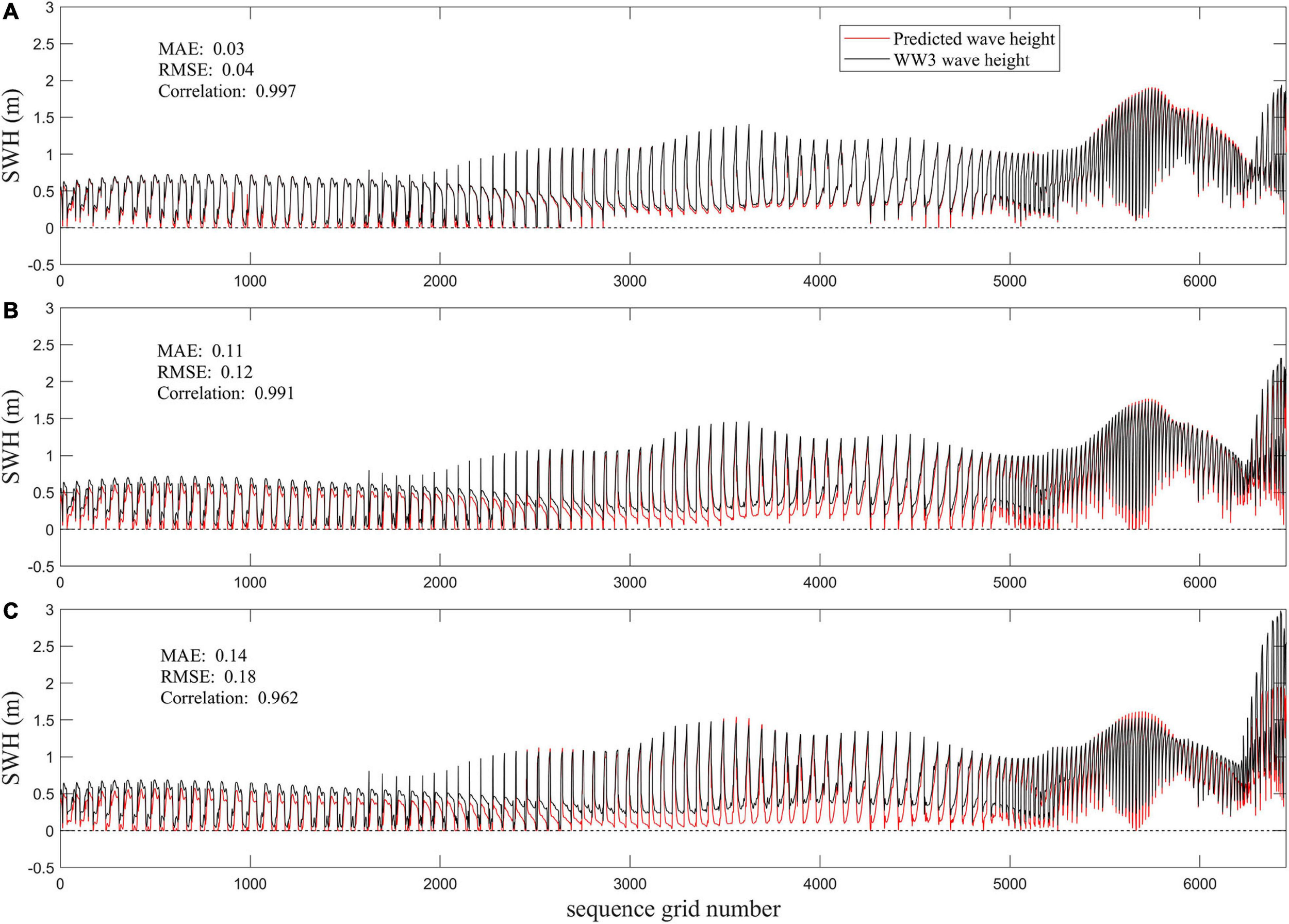 Ocean surface gravity waves (hereinafter, waves) are strongly non-linear and significantly affect ocean engineering activities, maritime operations, and transportation. Traditional wave forecasting models have been continuously developed and improved. Currently, the most widely used models are the WaveWatch III (WW3) by the US National Centers for Environmental Prediction, the Simulating Waves Nearshore (SWAN) by the Netherlands Delft University, and so on. The traditional numerical wave models are based on the wave action balance equation and adopt gridded discretization instead of differential equations. This inevitably introduces numerical errors and faces problems such as non-convergence and instability in numerical computations. Additionally, numerical models are highly sensitive to the simulated area terrain (especially in shallow nearshore waters) and computational domain boundaries. They also require input information of many other variables, such as wind data (Niu and Feng, 2021). Uncertainties of these external variables lead to additional model errors, which further affect the model’s accuracy. Numerical models also consume large amounts of computational resources and need to run for long periods of time, which is often impractical in emergency situations and thus is a significant bottleneck that restricts the development of fast and accurate wave forecasts.
