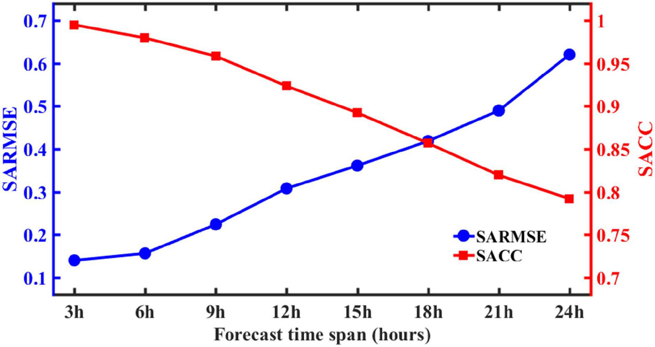 Variations in the SARMSE (blue) and SACC (red) of each training result with forecast time span.