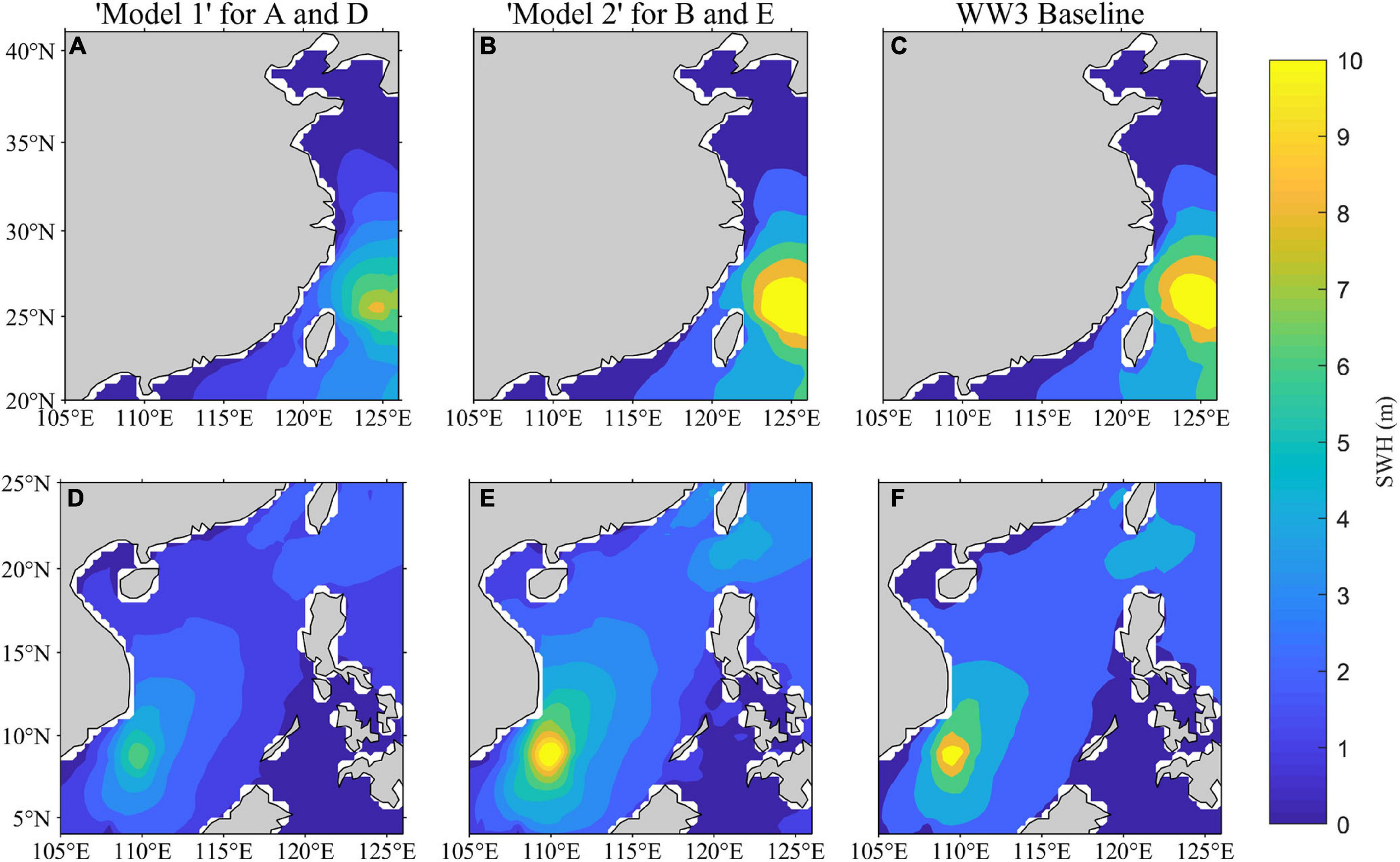 The SWH prediction results of Model 1 and Model 2 under typhoon conditions in the East China Sea and South China Sea. (A–C) SWH of Typhoon “Lekima” over the East China Sea at 18:00 on August 8, 2019. (D–F) SWH of Typhoon “Tembin” over the South China Sea at 21:00 on December 24, 2017.