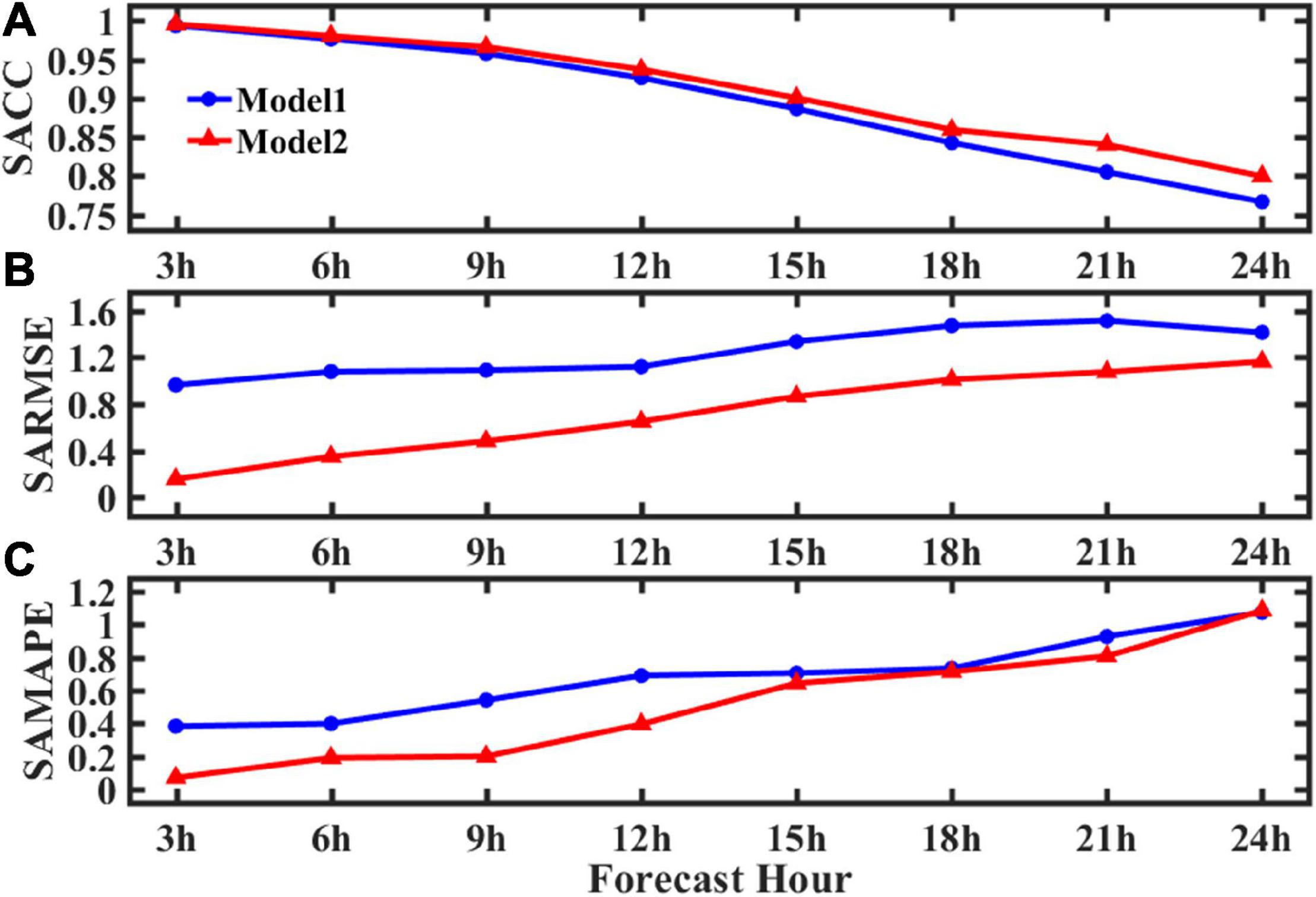 To further illustrate the difference in the wave forecasts with Model 1 and Model 2 under extreme state, changes of the forecast time span of Model 1 and Model 2 are examined. The error statistic results (SACC, SARMSE, and SAMAPE) are shown in Figures 6A–C, respectively. In Figure 6A, SACC of both Model 1 and Model 2 decreases almost linearly with the increase of the forecast time span, but the SACC of Model 2 is always higher than that of Model 1. In Figures 6B,C, both SARMSE and SAMAPE of Model 1 and Model 2 show an almost linear increasing trend. The SARMSE of Model 2 within 6 h is less than 0.5 m and the SAMAPE is less than 20%, while the SARMSE from Model 1 is at about 1 m and the SAMAPE at approximately 40%. When the forecast time span is 24 h, the SAMAPE of Model 2 becomes slightly higher than that of Model 1.