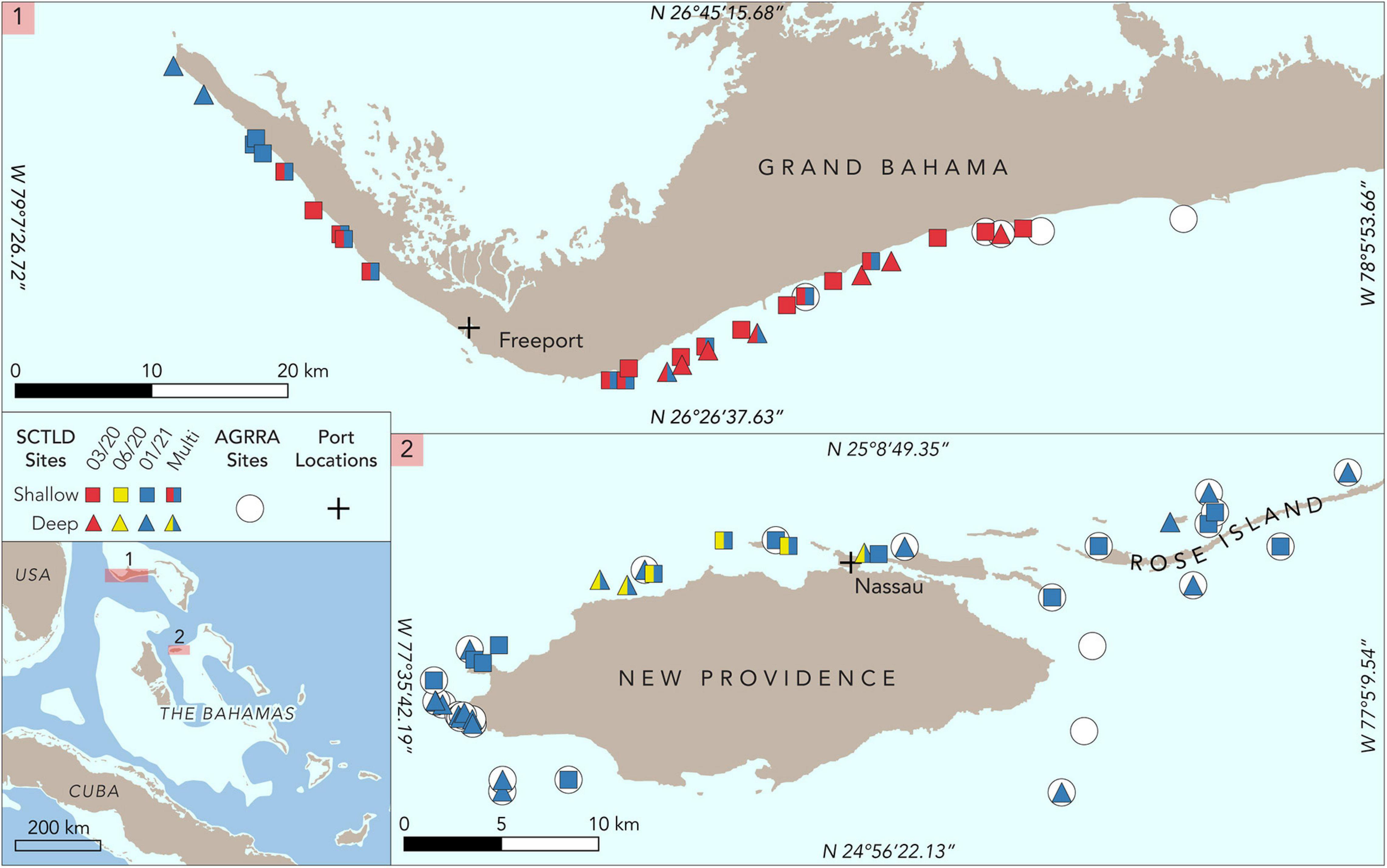 Reefs in both areas were well-studied prior to the detection of SCTLD. From 2011 to 2019, 24 reefs around New Providence and neighboring islands to the east (e.g., Rose Island) were monitored every 2 to 4 years using Atlantic and Gulf Rapid Reef Assessment (AGRRA) methods (Dahlgren et al., 2014, 2016, 2020). Eighteen reefs around Grand Bahama were also assessed two to four times using AGRRA methods from 2013 to 2019 (Dahlgren et al., 2016, 2020).