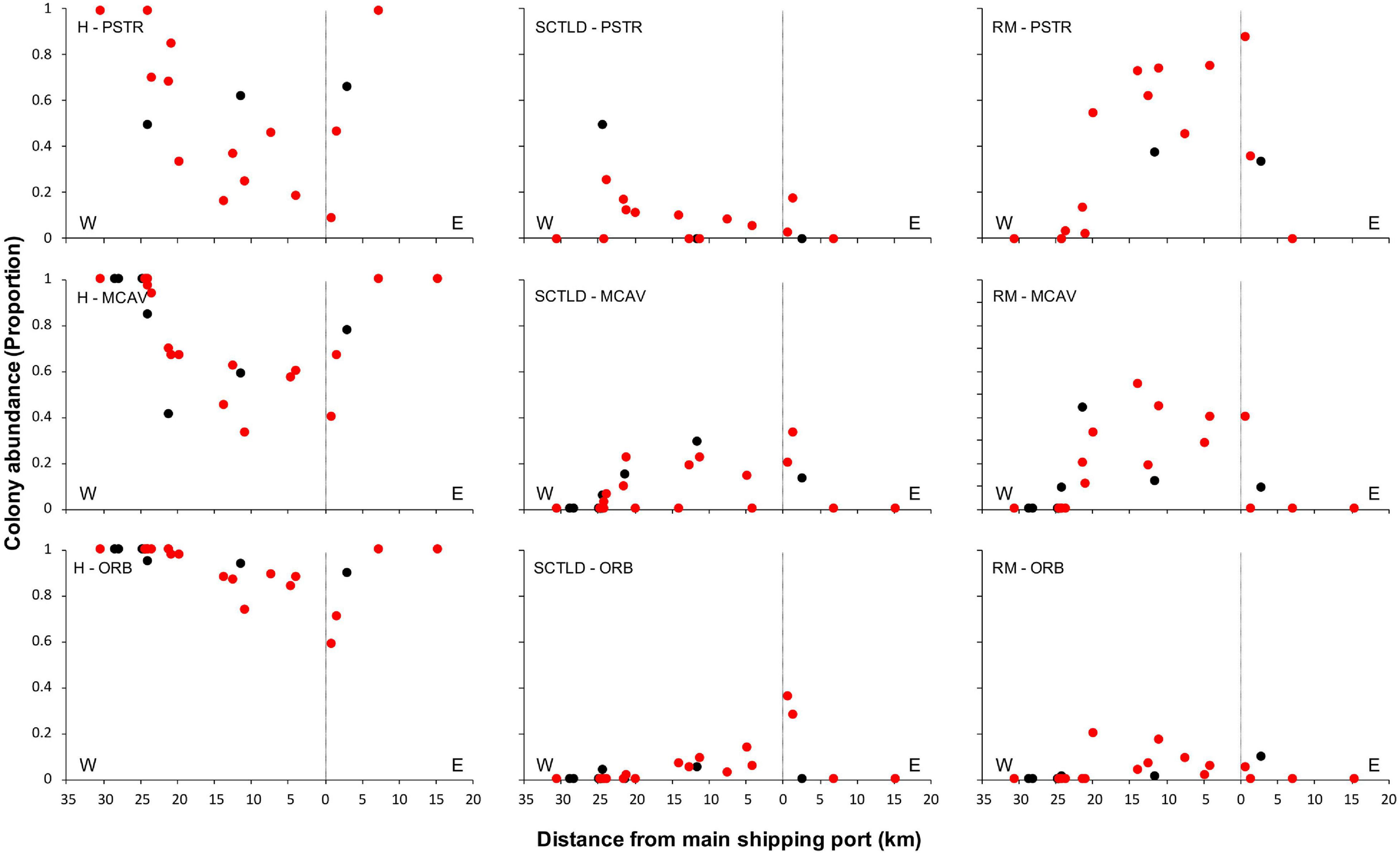 The total number of each coral species observed and the overall infection rates and mortality rates were calculated for each species on reefs of each island to determine the most abundant species that were affected by SCTLD for further analyses of spatial and temporal patterns of the SCTLD outbreak on each island. Spatial patterns of the disease outbreak were assessed for Grand Bahama and New Providence separately with mixed-effects generalized linear models (GLM) using SPSS software for the five most abundant taxa that were observed to be susceptible to SCTLD. Using this model, the proportion of each species that was healthy, infected with SCTLD, or had experienced recent mortality for the entire colony was compared among sites after applying a logistic transformation to proportion data and excluding data from any sites where there were less than three colonies of the species observed. Models were run separately for each species. Factors in the models included distance from the commercial shipping ports of Freeport (Grand Bahama) or Nassau (New Providence) as a continuous variable and categorical variables of direction (east or west) of the port and depth. Sites <10 m were classified as shallow, and sites >10 m were classified as deep. Distance was calculated as the shortest in-water distance between the port location and the survey site. This was computed using the ArcGIS Pro Euclidean Distance Tool with the port locations as source sites, including the outline of the land at 30-m resolution as a barrier layer and sampling the resulting distance at each of the survey points.