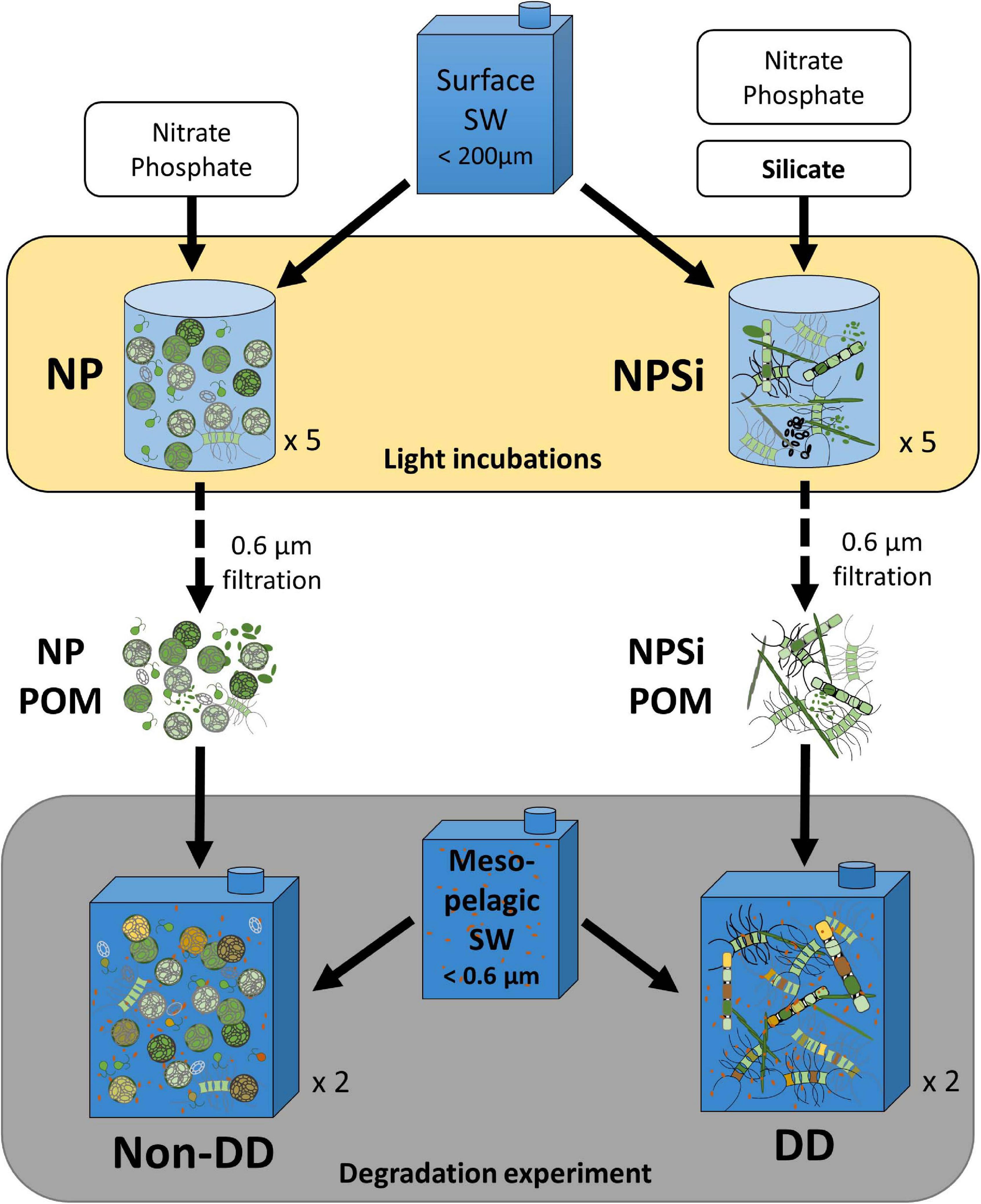 Schematic representation of the experimental design. Light incubations (NP and NPSi) were used to induce phytoplankton proliferations of contrasting diatom dominance from a surface seawater sample enriched with different inorganic nutrient solutions. POM collected from the NP and NPSi incubations were each resuspended into mesopelagic seawater, comprising the two treatments of the degradation experiment: non-diatom dominated (non-DD) and diatom dominated (DD) treatments, respectively. The 19-day degradation experiment was performed in the dark at 14°C.
