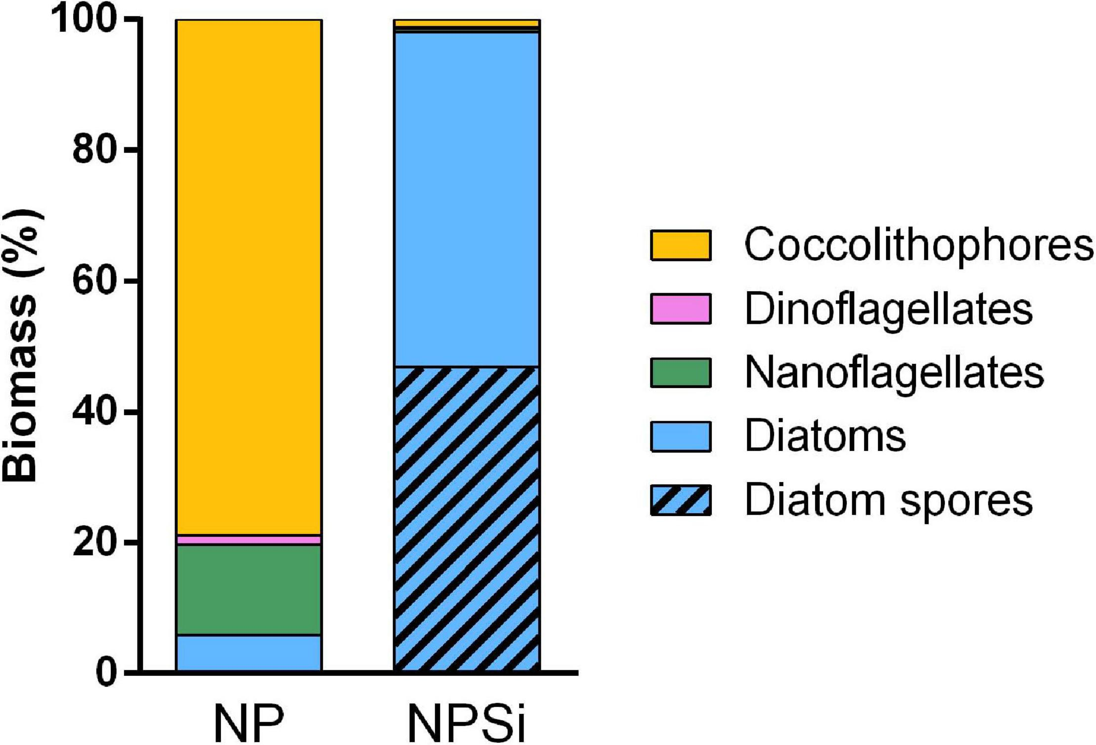 In the NP incubation, coccolithophores had a substantial contribution although they were not as dominant as diatoms were in the NPSi incubation (Figure 2). The low contribution of diatoms to the estimated NP biomass (6%) is probably a lower limit estimate, as the state of diatoms at the end of the NP incubation made their identification and enumeration challenging. This probably contributed to the mismatch between estimated phytoplankton biomass (62 μmol C L–1) and measured POC concentration (80 ± 3 μmol C L–1). The “aged” appearance of diatoms in the NP incubation indicates that the succession of phytoplankton functional groups played an important role in the bloom dynamics of this incubation. In fact, earlier samples of NP incubation had a much higher diatom contribution (Supplementary Figure 2). Diatoms, which outcompete coccolithophores under pulsing nutrient supply dynamics (Cermeño et al., 2011), would have better exploited the initial nutrient addition and dominated the production in the NP incubation production until silicate was exhausted, when coccolithophores would have been able to increase their dominance.