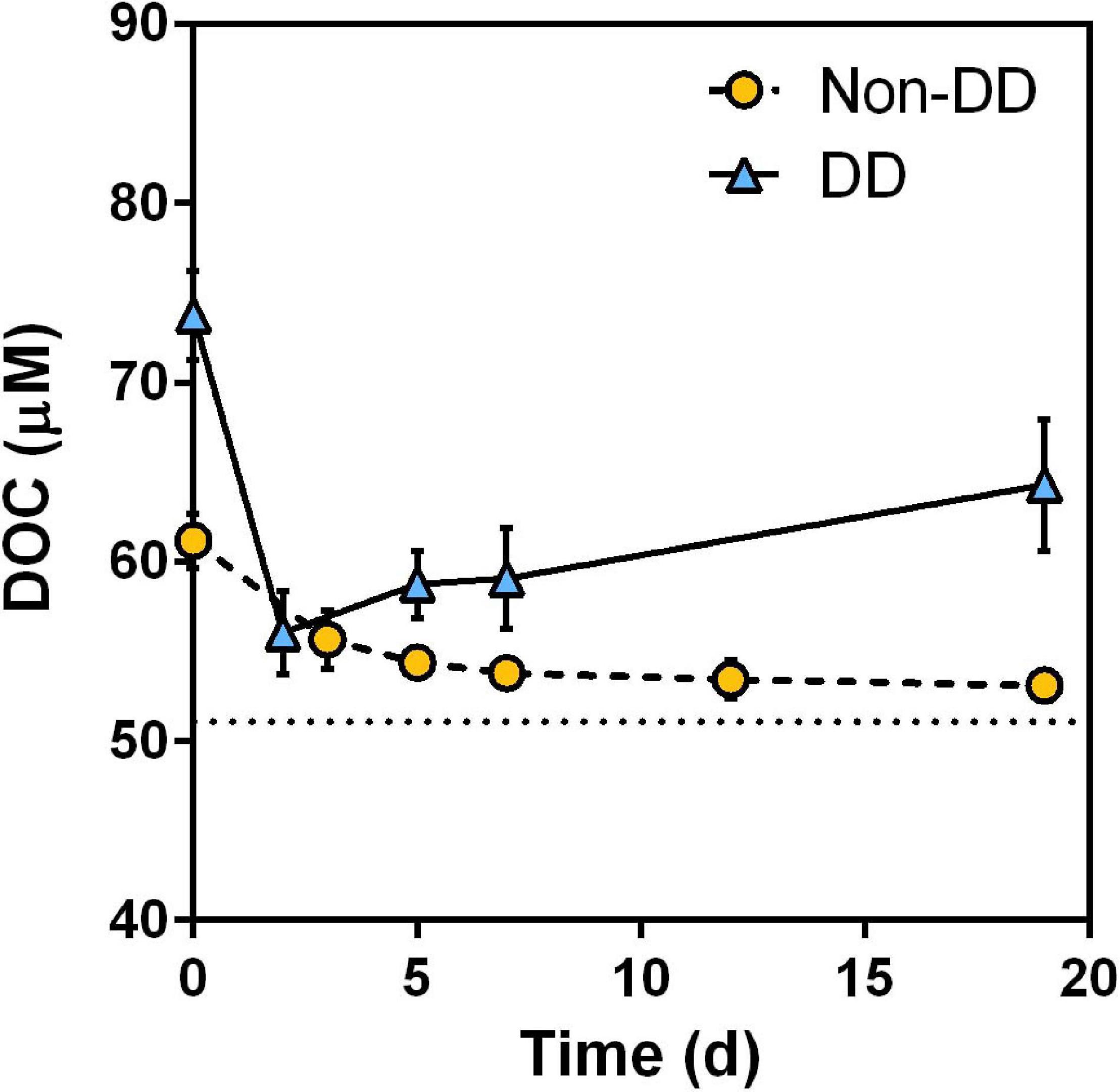 At the start of the experiment, immediately after the resuspension of POM from the light incubations into the mesopelagic water, DOC concentration of both treatments showed a sudden increase proportional to the added POC when compared to the mesopelagic water DOC (Figure 3). Then, DOC concentration of each treatment behaved differently; while DOC exhibited a consistent decrease in the non-DD treatment throughout the experiment, DOC concentration in the DD treatment experienced a pronounced initial drop and then it increased for the remaining of the experiment. Throughout the experiment, DOC concentration of both treatments remained above that of the mesopelagic water without the addition of particulate material, which showed no significant variation between the start and end of the experiment (t-test, p = 0.33).