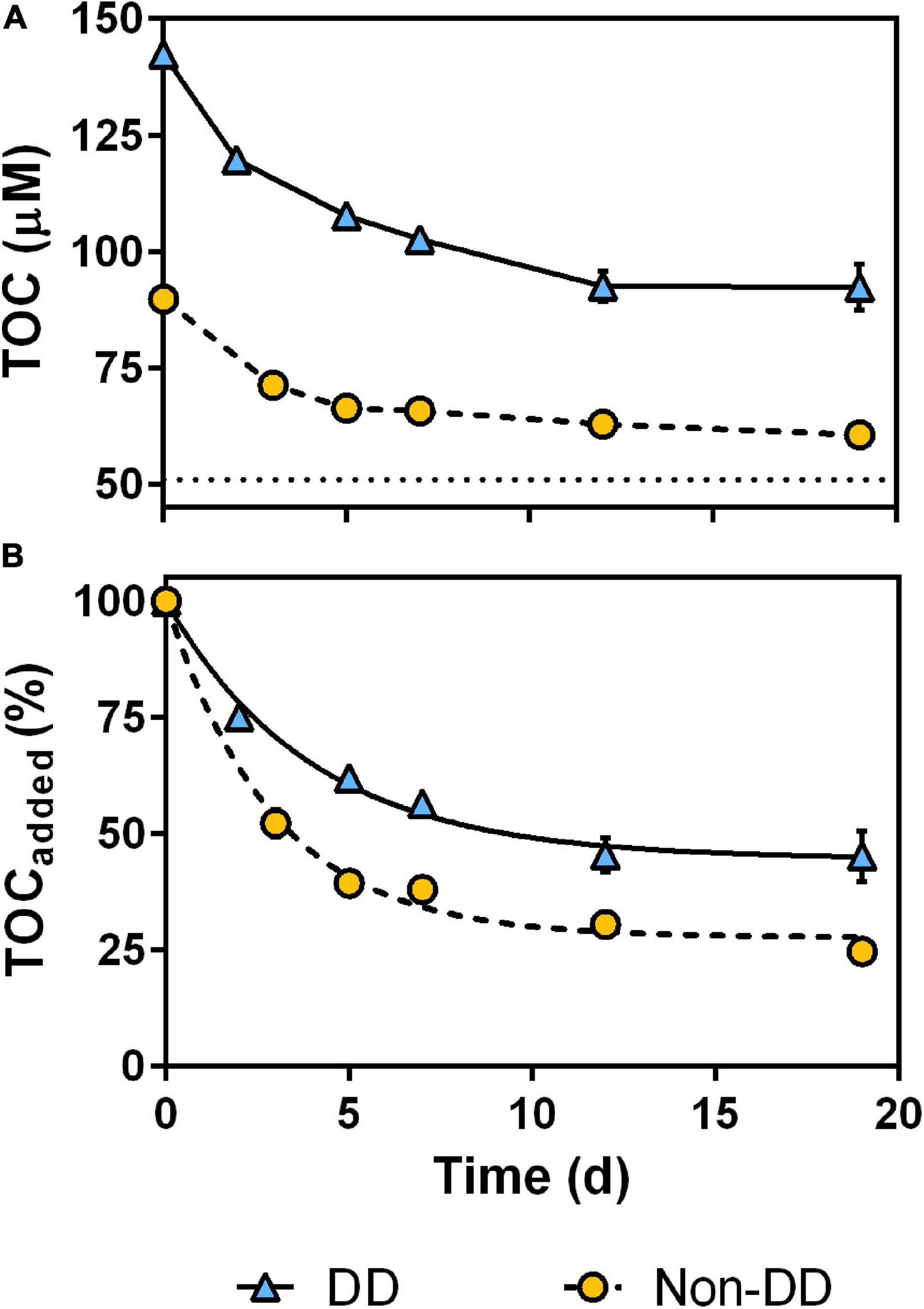 Despite their different values at the beginning of the experiment, TOC concentrations followed remarkably similar dynamics in both treatments (Figure 4A), decreasing rapidly during the first days and remaining more or less constant by the end of the experiment. When normalized to the added initial TOC (calculated as the difference between the initial TOC concentrations of the treatments and the mesopelagic water DOC), it becomes apparent that DD treatment TOC was remineralized at a slower rate and to a lesser extent than that of the non-DD treatment (Figure 4B), as denoted from the differences in the best-fit parameters of their decay curves (Table 2). TOC losses in each treatment showed statistically different degradation rates (k) and degradable fractions (OCreact).