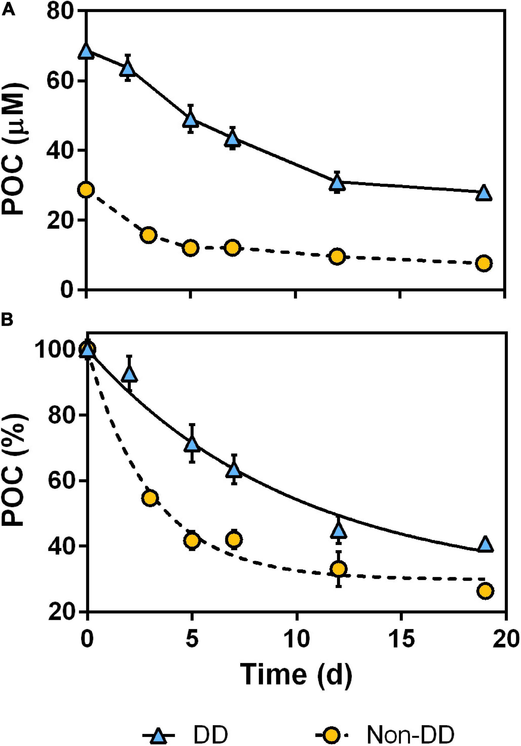 Losses in POC concentration during the experiment (Figure 5A) behaved similarly to those observed for TOC (Figure 4A) in the non-DD treatment, with most of the degradation taking place within the first 5 days of the experiment. The DD treatment showed an overall slower decrease for POC than for TOC, with little decrease during the first 2 days of dark incubation and a similar loss during the first 7 days than during the remaining of the experiment (Figure 5A). Examining the POC losses relative to the respective initial concentrations of each treatment (Figure 5B) helps to appreciate how much faster POC was degraded in the non-DD treatment: the decay curve fitted for the non-DD treatment had a decay constant (k) that was three times higher than that of the DD treatment (Table 2). The fraction of degradable POC however, was similar between treatments. Model comparisons between the two OC pools in each treatment (Table 2) revealed that, in the non-DD treatment, TOC and POC kinetic parameters were not statistically different, whereas in the DD treatment each OC pool had different degradation rates (k) and degradable fractions (OCreact).