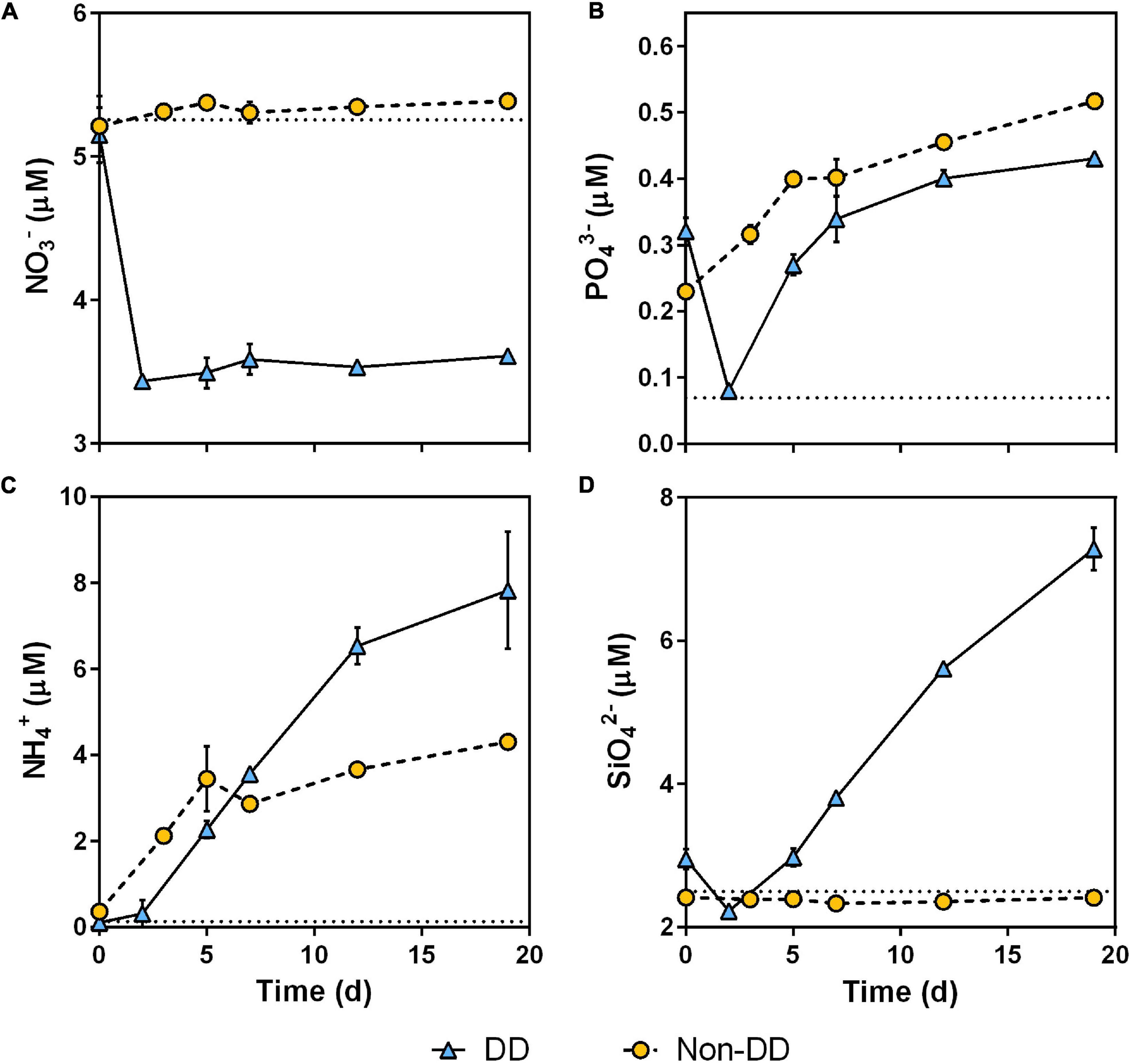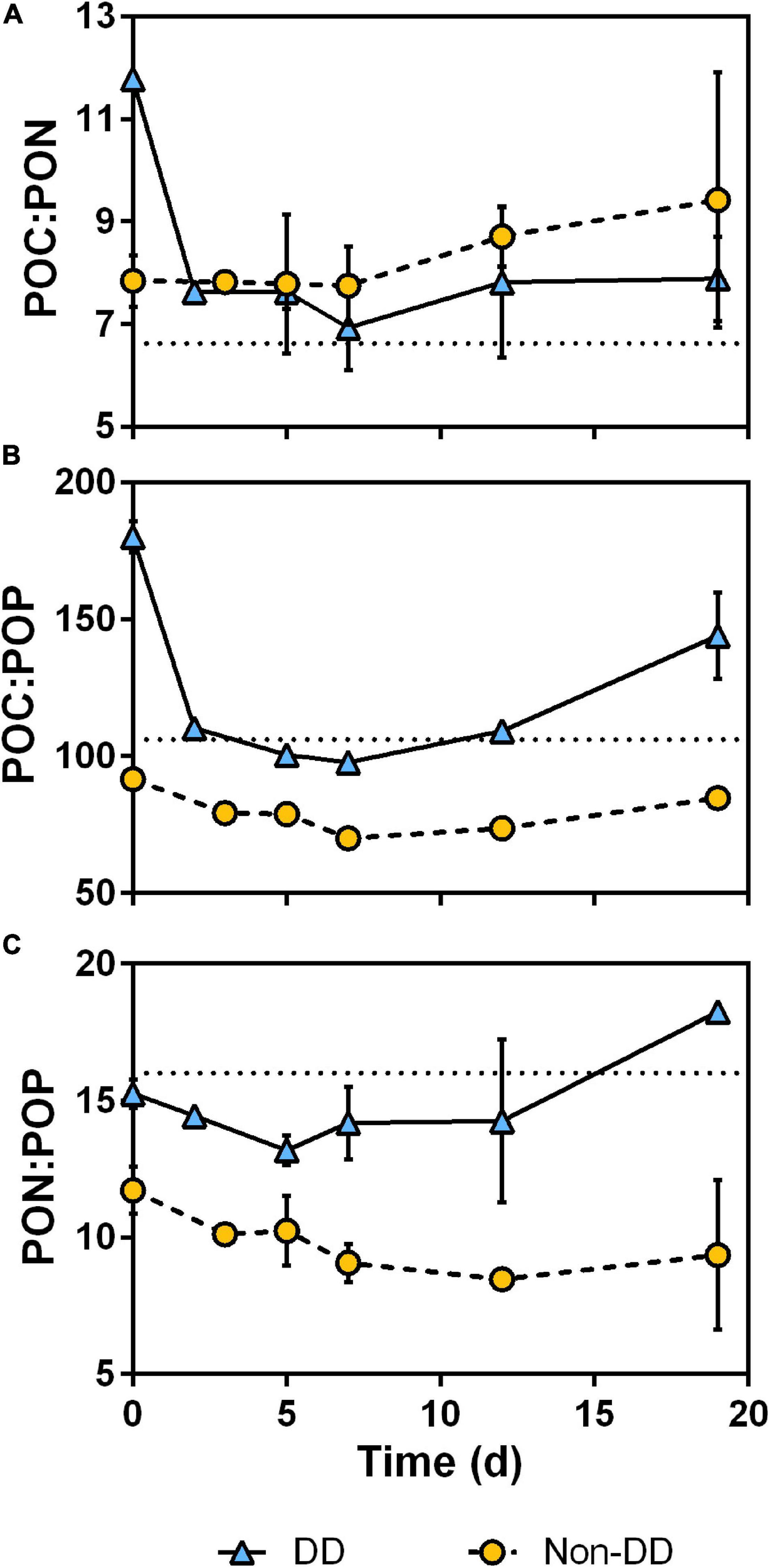 The N:P ratio also exhibited variations (Figure 6C); the non-DD treatment experienced a decrease in its N:P ratio during the first half of the experiment from 11.7 ± 0.9 at the beginning to 8.5 ± 0.3 on day 12. The mean N:P ratio of the DD treatment on the other hand decreased during the first 5 days of the experiment and then started to increase.