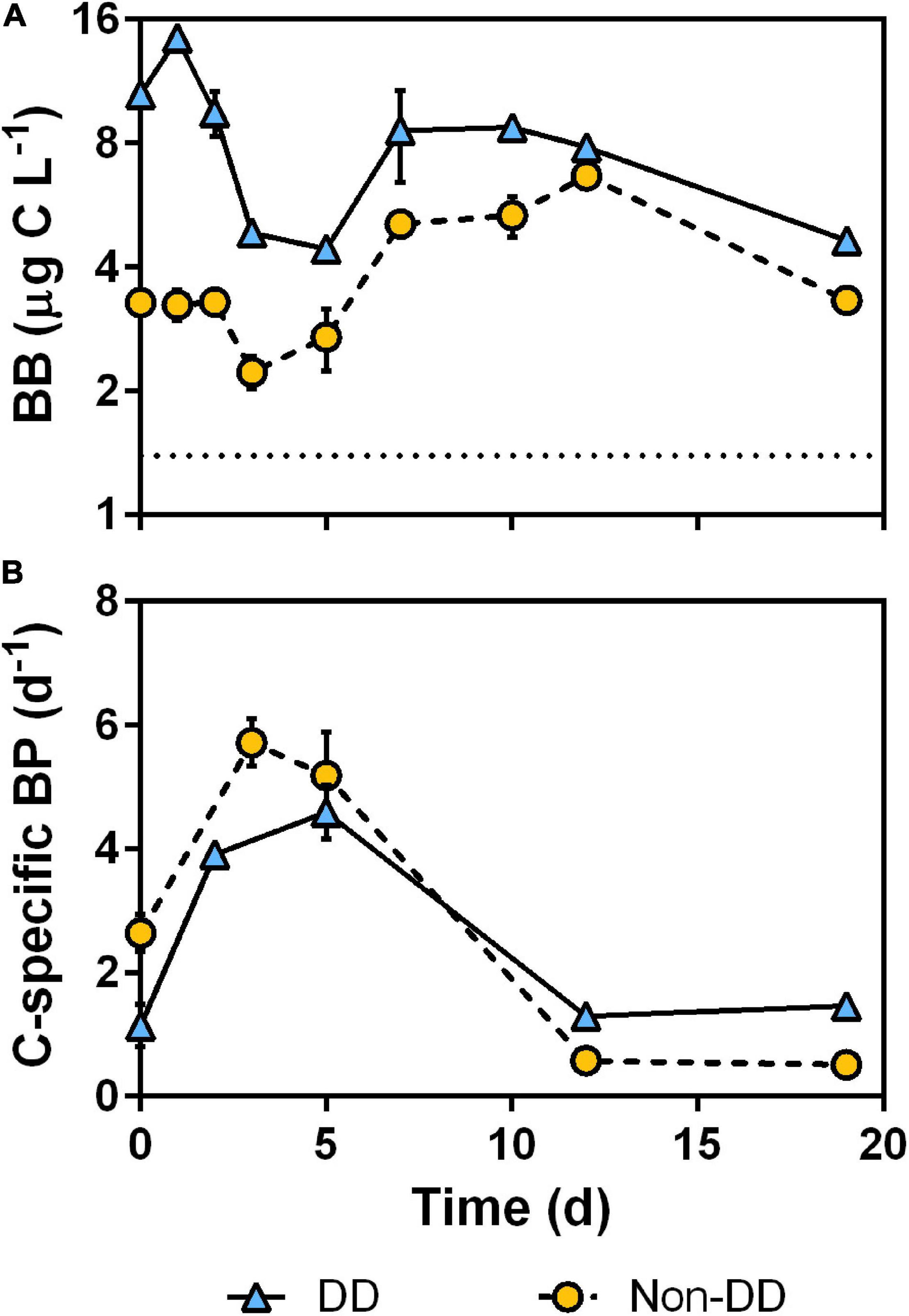 Bacterial biomass (BB) behaved similarly in both treatments (Figure 8A), with one maximum at the beginning of the experiment, a substantial decrease at day 3 and then BB rose to a second maximum around the middle point of the experiment. The DD treatment exhibited higher BB values than the non-DD treatment throughout the experiment and, in both treatments, the BB started with values higher than those of the mesopelagic sample. The C-specific BP was higher in the non-DD treatment during the first half of the experiment, whereas the DD treatment exhibited higher values during the second half. Despite their different values, both treatments followed the same pattern in their C-specific BP: an initial increase from their initial values reaching the maximum after 3–5 days of incubation and then the C-specific BP dropped and remained low for the second half of the experiment (Figure 8B).