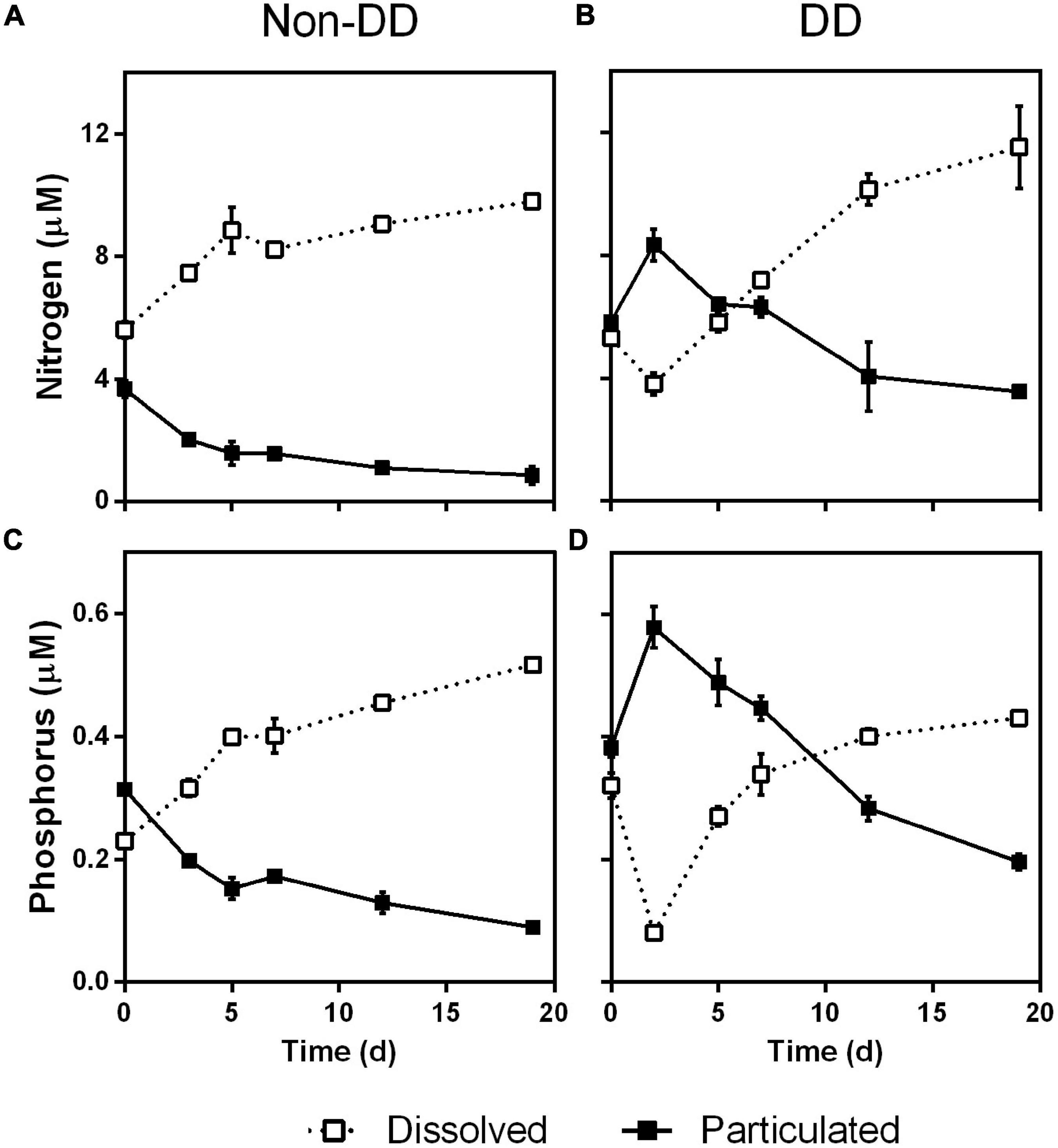Time course of nitrogen (A,B) and phosphorus fractions (C,D) for the non-DD (A,C) and DD (B,D) treatments. Dissolved fractions are inorganic forms of N (ammonia, nitrate, and nitrite) and P (phosphate); particulated fractions are PON and POP. Data are mean and standard deviation of two experimental replicates.