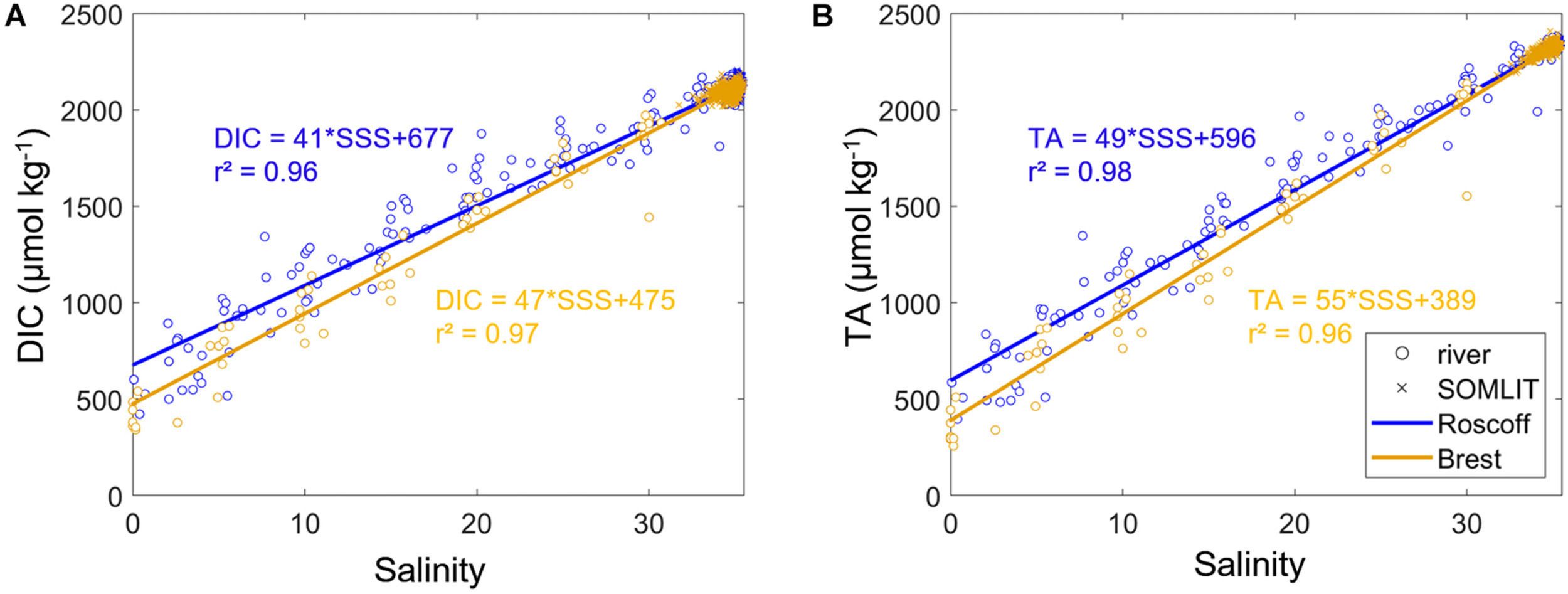Linear regressions between (A) dissolved inorganic carbon concentration (DIC, μmol kg– 1) and sea surface salinity (SSS), and (B) total alkalinity (TA, μmol kg– 1) vs. SSS based on the data collected at Penze/Morlaix rivers (blue circles) in 2010–2011 and 2019–2020 and Roscoff stations (SOMLIT-pier and SOMLIT-offshore, blue asterisks) from 2008 to 2019 and Elorn and Aulne rivers (orange circles) in 2009–2010 and SOMLIT-Brest (orange asterisks) from 2008 to 2019.