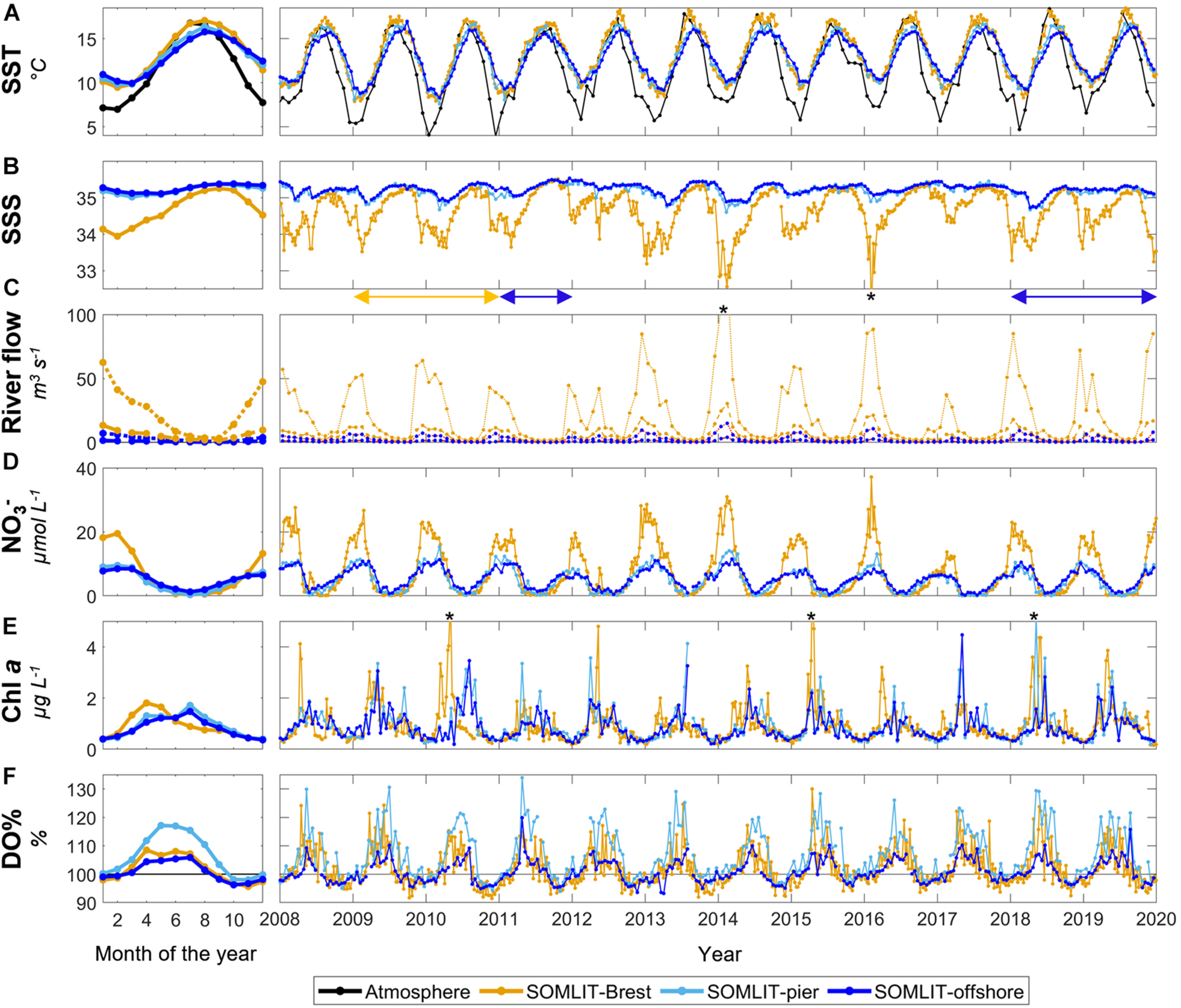 Monthly mean climatology for (A) sea surface temperature (SST, °C), (B) sea surface salinity (SSS), (C) river flow (m3 s–1), (D) nitrate (μmol L–1), (E) Chl a (μg L–1), and (F) oxygen saturation (DO%, %) at SOMLIT-Brest (orange), SOMLIT-pier (light blue), and SOMLIT-offshore (dark blue), from January 2010 to December 2017, and the associated time series of weekly/bimonthly data from January 2008 to January 2020. (C) Brest river flow is shown in orange and Roscoff river flow is shown in blue. The black line represents the atmospheric temperature (°C). The monthly mean climatologies were computed based on complete years acquired from January 2010 to December 2017. Salinity values down to 32.5 and 31.7 (out of the figure range and indicated by black asterisks) were observed in February 2014 and February 2016, respectively. In February 2014, river flow values up to 130 m3 s–1 were observed in the Aulne river (indicated by a black asterisk). Chl a concentrations of 5.9, 6.3, and 5.2 μg L–1 were observed in May 2010, April 2015, and May 2018 (indicated by a black asterisk), respectively. Blue double-arrows below the SSS plot represent the period of sampling in the Roscoff rivers, and the orange double-arrow represents the period of sampling of the Brest rivers.