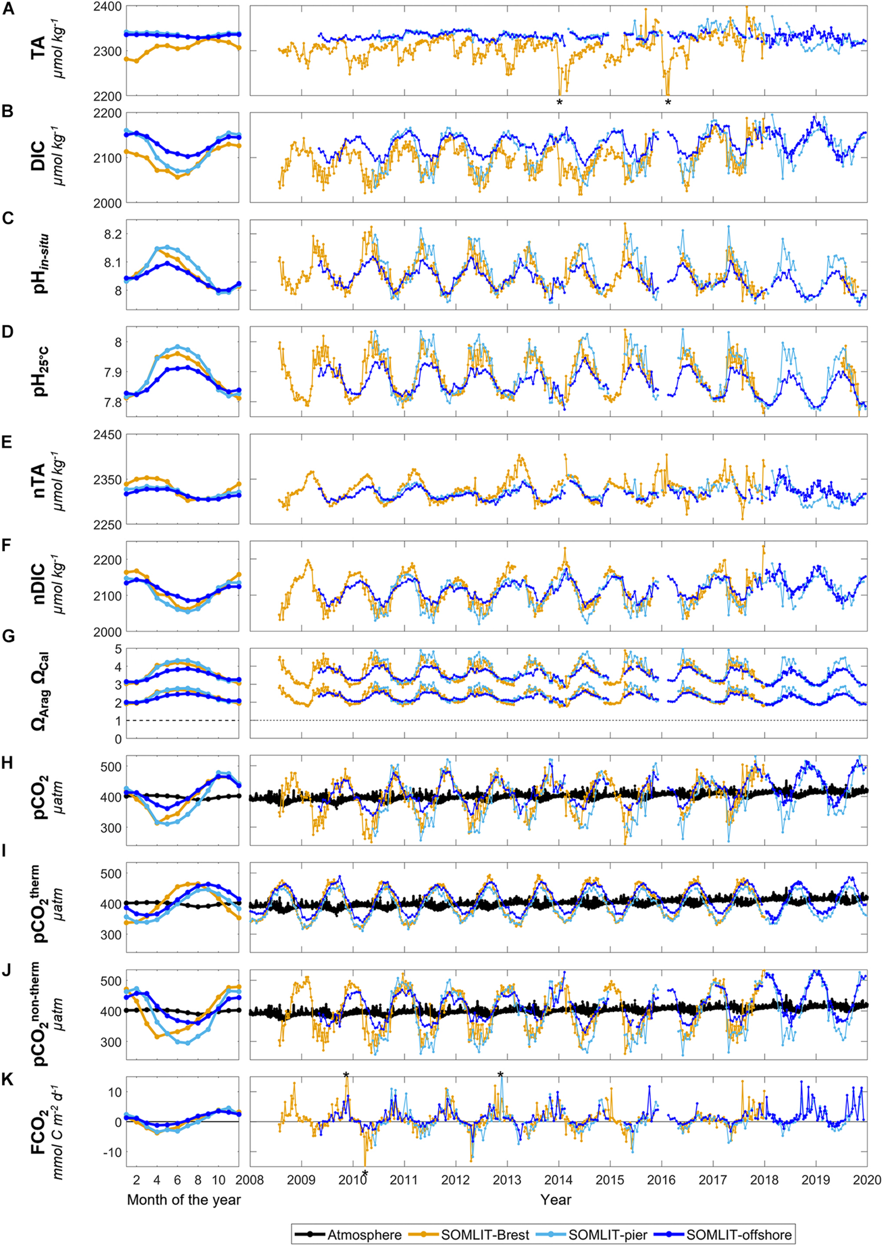 Monthly mean climatology for (A) total alkalinity (TA, μmol kg–1), (B) dissolved inorganic carbon (DIC, μmol kg–1), (C) pHin situ, (D) pH25°C, (E) SSS normalized TA (nTA, μmol kg–1), (F) SSS normalized DIC (nDIC, μmol kg–1), (G) ΩArag and ΩCal, (H) pCO2 (μatm), (I) pCO2therm (μatm), (J) pCO2non–therm (μatm), and (K) FCO2 (mmol C m– 2 day–1) at SOMLIT-Brest (orange), SOMLIT-pier (light blue), and SOMLIT-offshore (dark blue), from January 2010 to December 2017, and the associated time series of weekly/bimonthly data from January 2008 to January 2020. The black line represents atmospheric pCO2 (μatm). TA values down to 2194 and 2181 μmol kg–1 (out of figure range and indicated by black asterisks) were observed in January 2014 and February 2016, respectively. FCO2 values of 18.9, –20.82, and 17.3 mmol C m– 2 day–1 were recorded in November 2009, March 2010, and November 2012 (indicated by a black asterisk), respectively. nTA and nDIC computations were based on Friis et al. (2003) and the SSS vs. TA/DIC relationships from Figure 2.