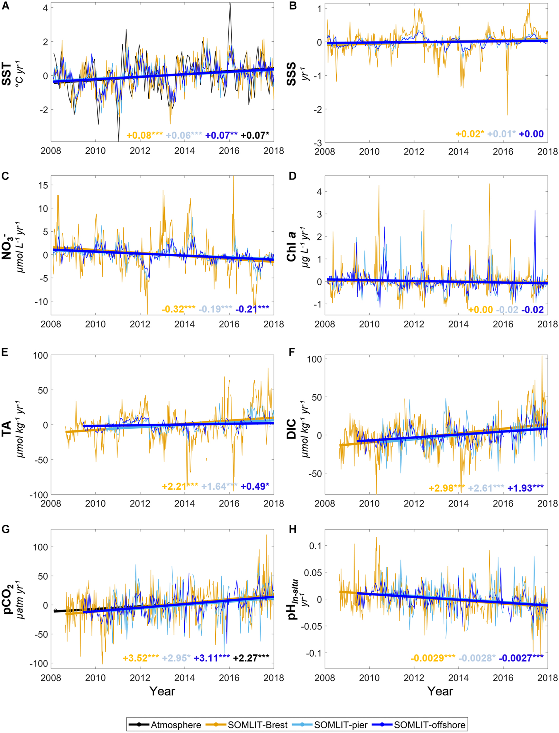 Climatologies were computed based on monthly means over the entire period of study. Data were detrended for seasonality by subtracting the respective monthly mean climatology computed for the study period to the time series (hereafter “monthly means”). The resulting residuals were analyzed using linear regressions to compute anomaly trends, called “monthly anomaly trend.” This approach follows methods from Niu (2013) applied on seawater parameters by Tréguer et al. (2014) and Bates et al. (2014) to allow for comparisons of trends observed at different time-series stations. All analyses were performed with Matlab 2020a.