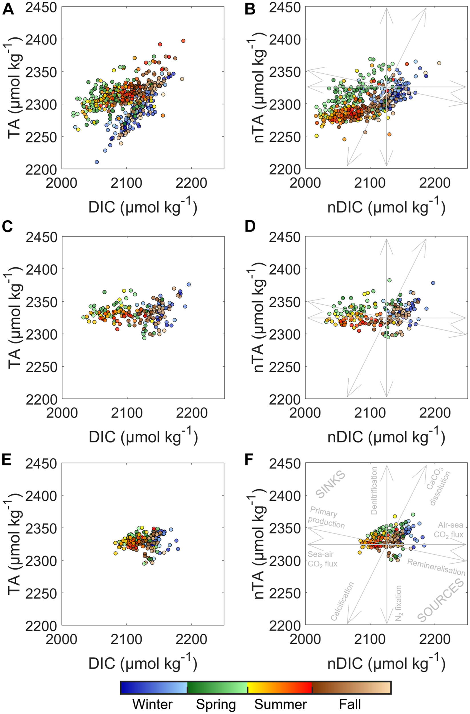 The remainder of DIC changes were assigned to biological processes, such as the effect of photosynthesis, respiration, degradation of organic matter, or calcification/dissolution of CaCO3.
