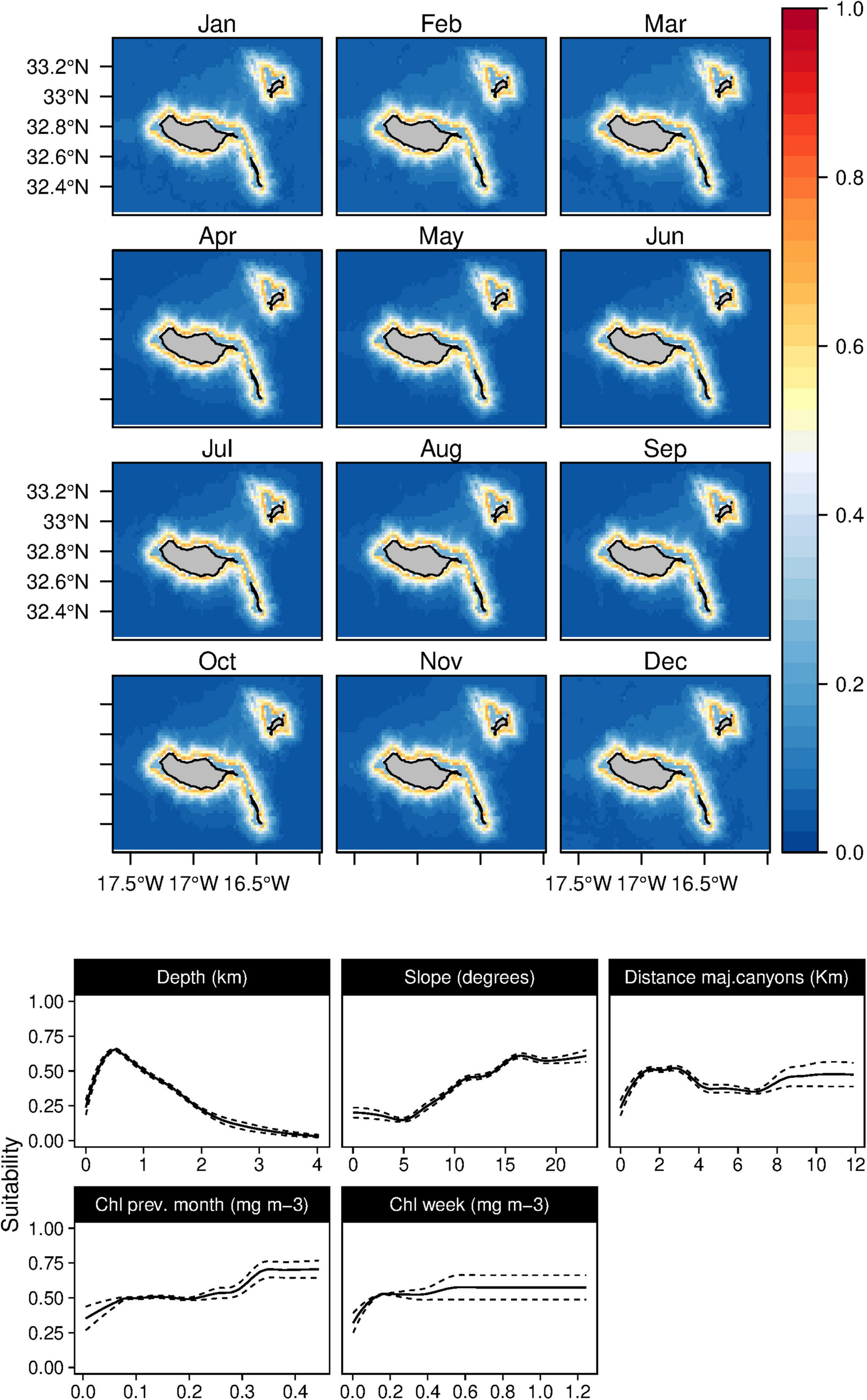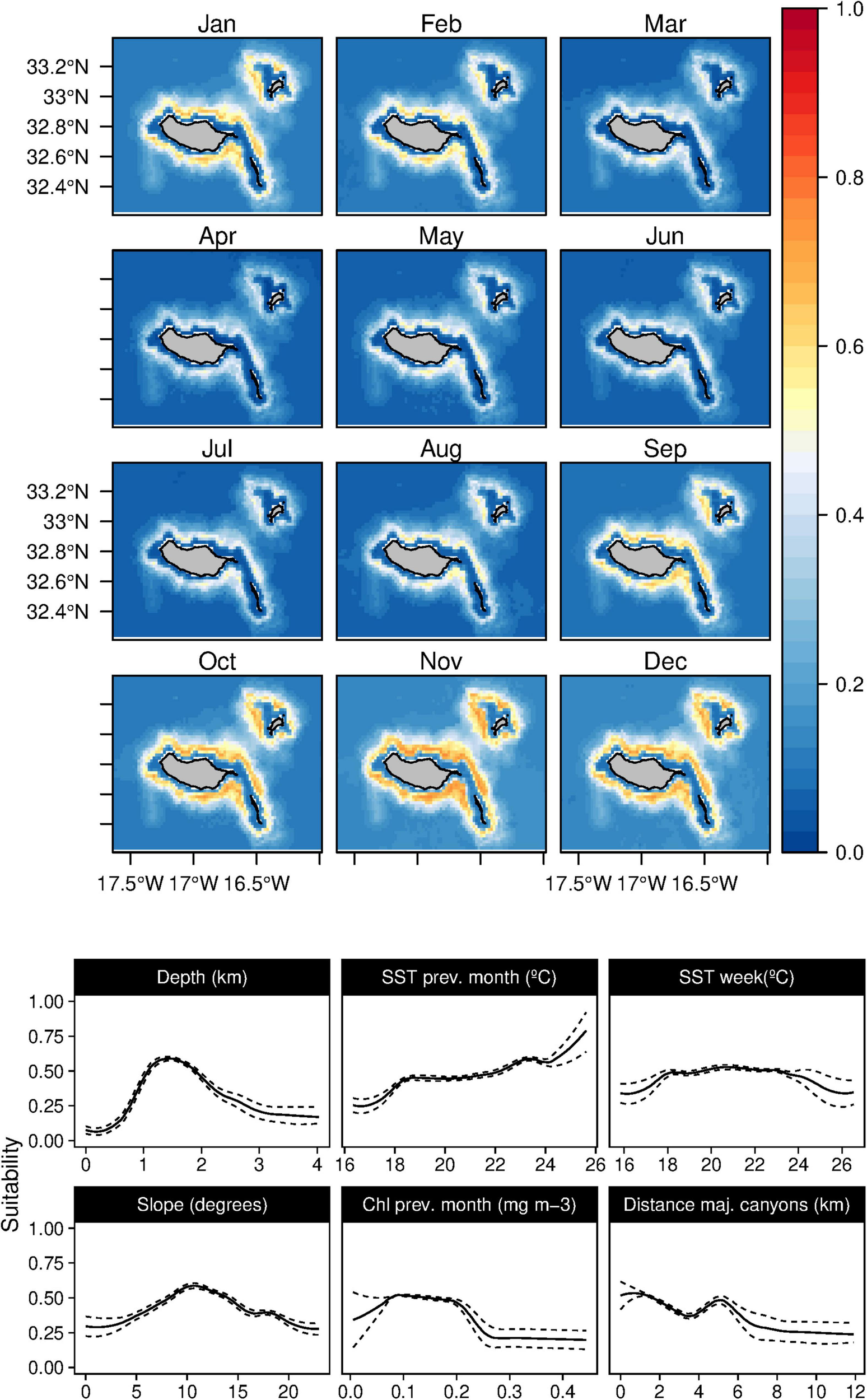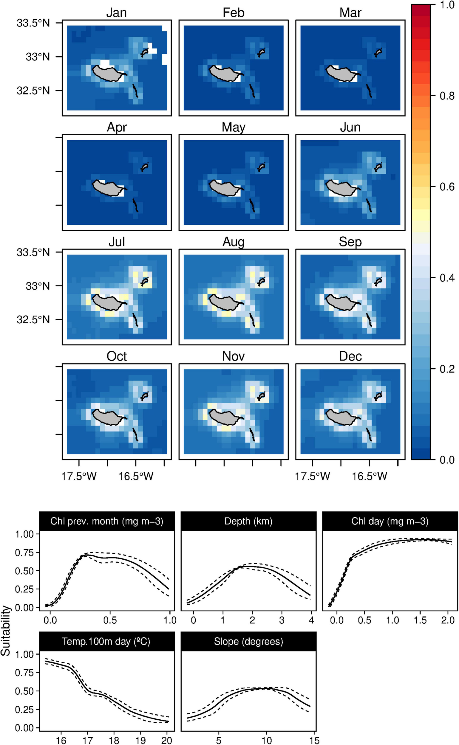 The suitability for bottlenose dolphins (T. truncatus) was found to be primarily related to the bathymetry, slope, and distance to the major canyons, contributing up to 98% to the selected model (Table 3). The species suitability was positively linked to relatively shallow waters with high slope values and somehow close to major canyons. Even if marginal, there is also a preference for waters with high Chl-a values (Figure 5). These outcomes produced a generalist distribution of the species on Madeira’s coastal areas with almost no temporal variability, also reflected on the low values of standard deviation maps (Supplementary Figure 4).