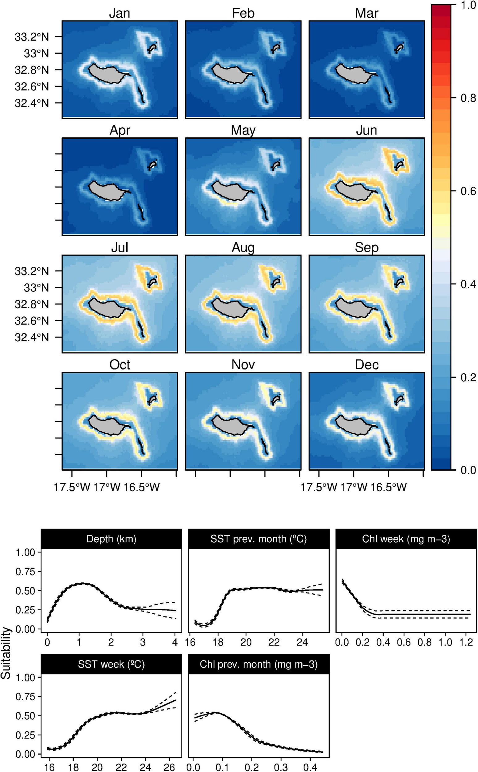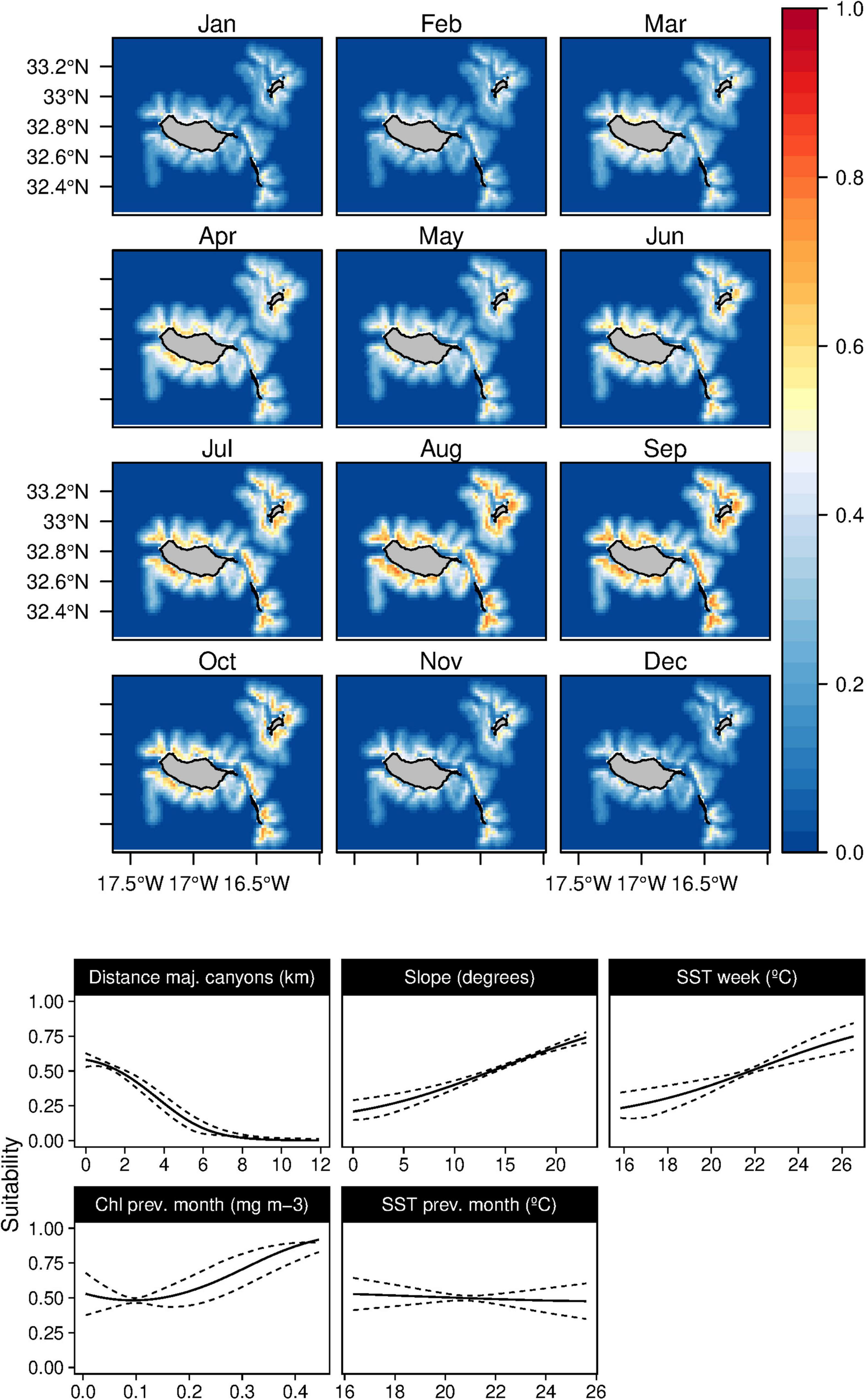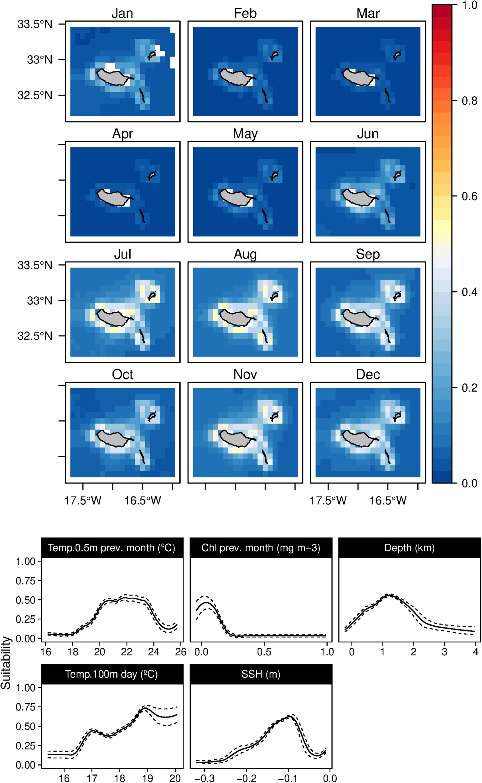 Mean monthly suitability maps (above) and smoothed response curves with standard deviation (below) in the Madeira archipelago for Globicephala macrorhynchus for the “8-days” models. In the maps, red represents more suitable and blue less suitable. Responses curves are ordered by percent contribution of the environmental variables.