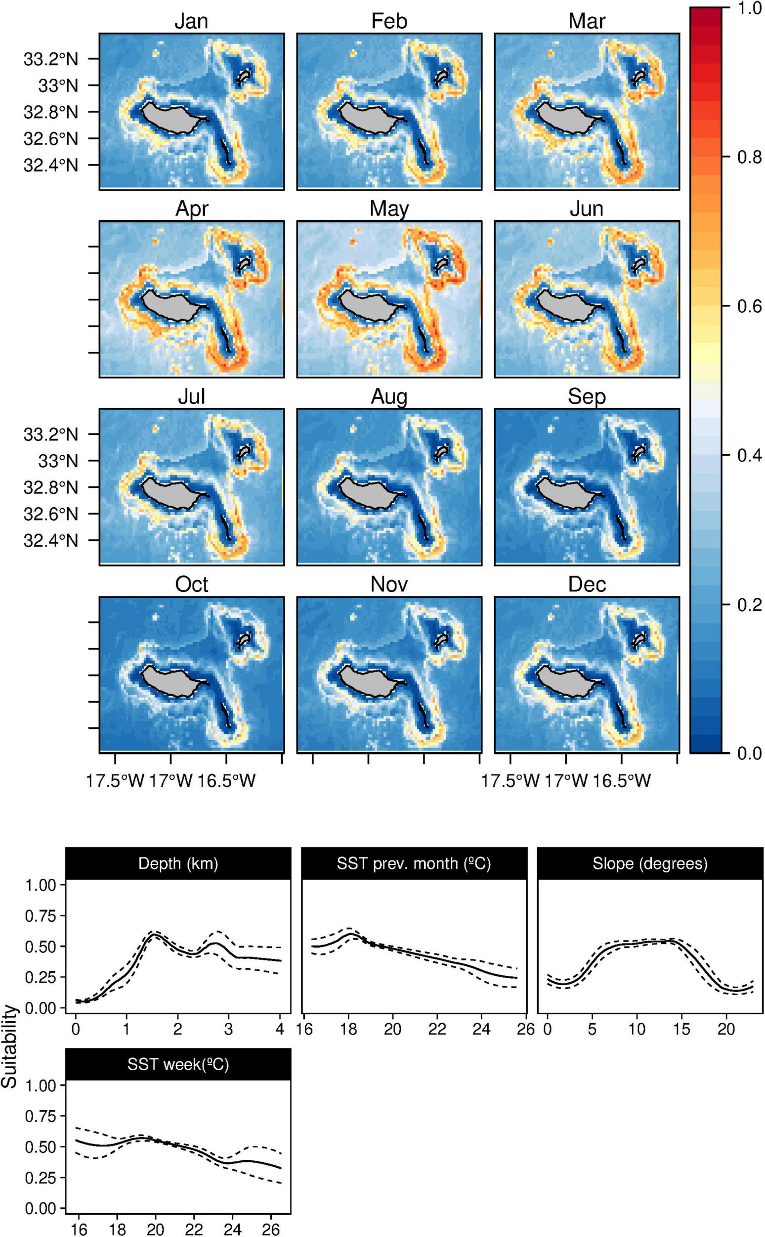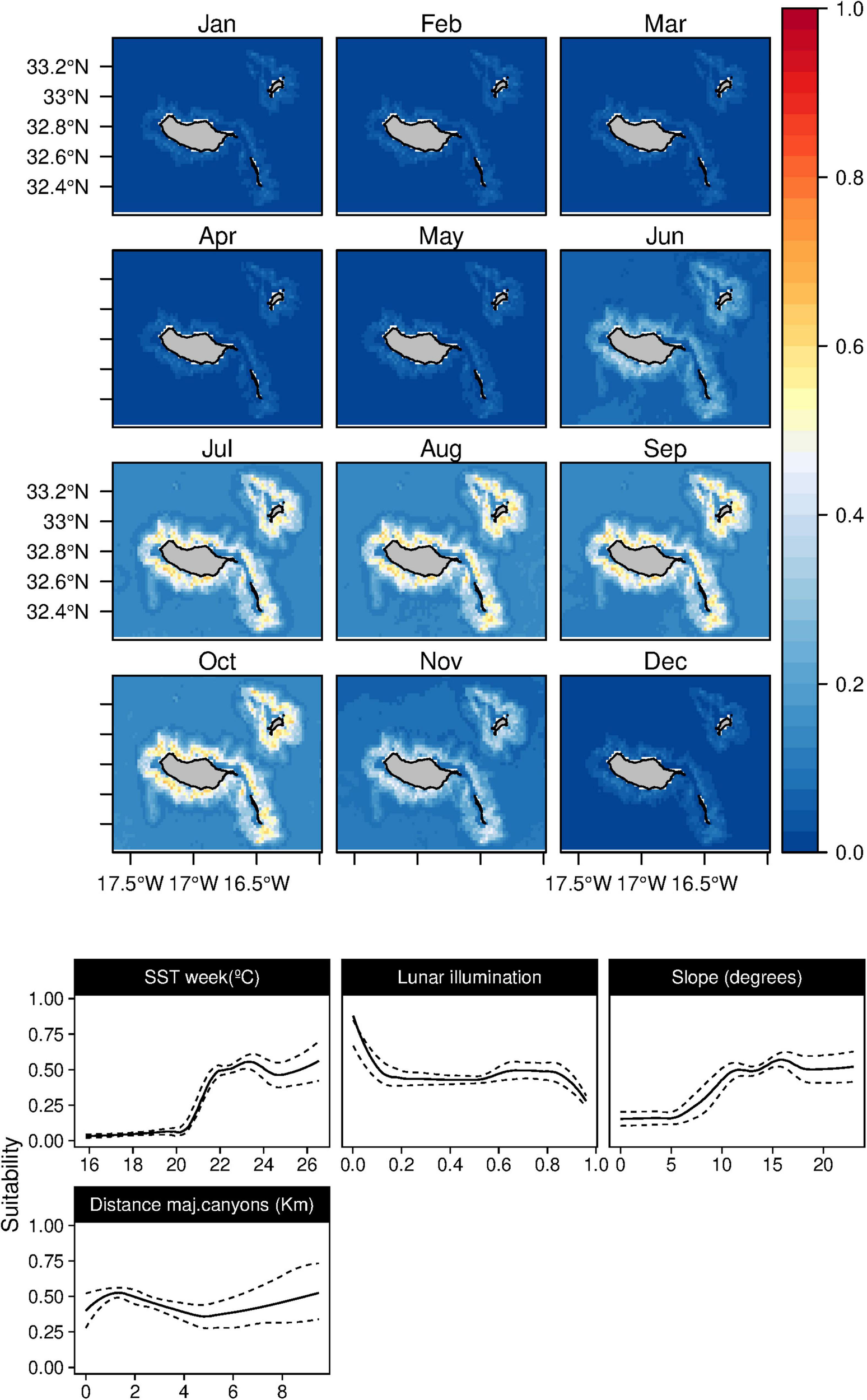 Mean monthly suitability maps (above) and smoothed response curves with standard deviation (below) in the Madeira archipelago for Mesoplodon densirostris for the “8-days” models. In the maps, red represents more suitable and blue less suitable. Responses curves are ordered by percent contribution of the environmental variables.
